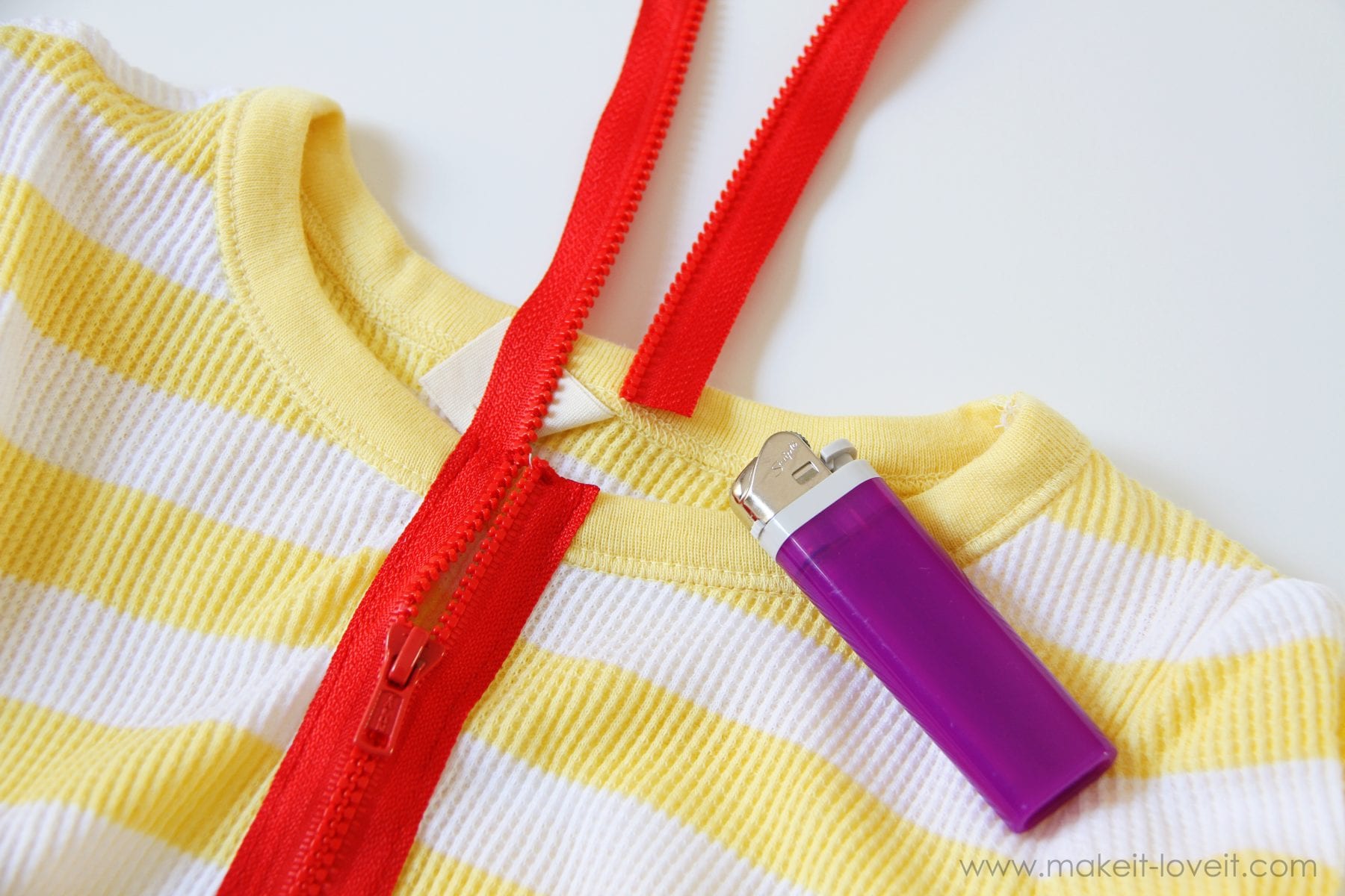 Then cut off the zipper right above the next zipper tooth and then melt the edge of the zipper with a lighter.