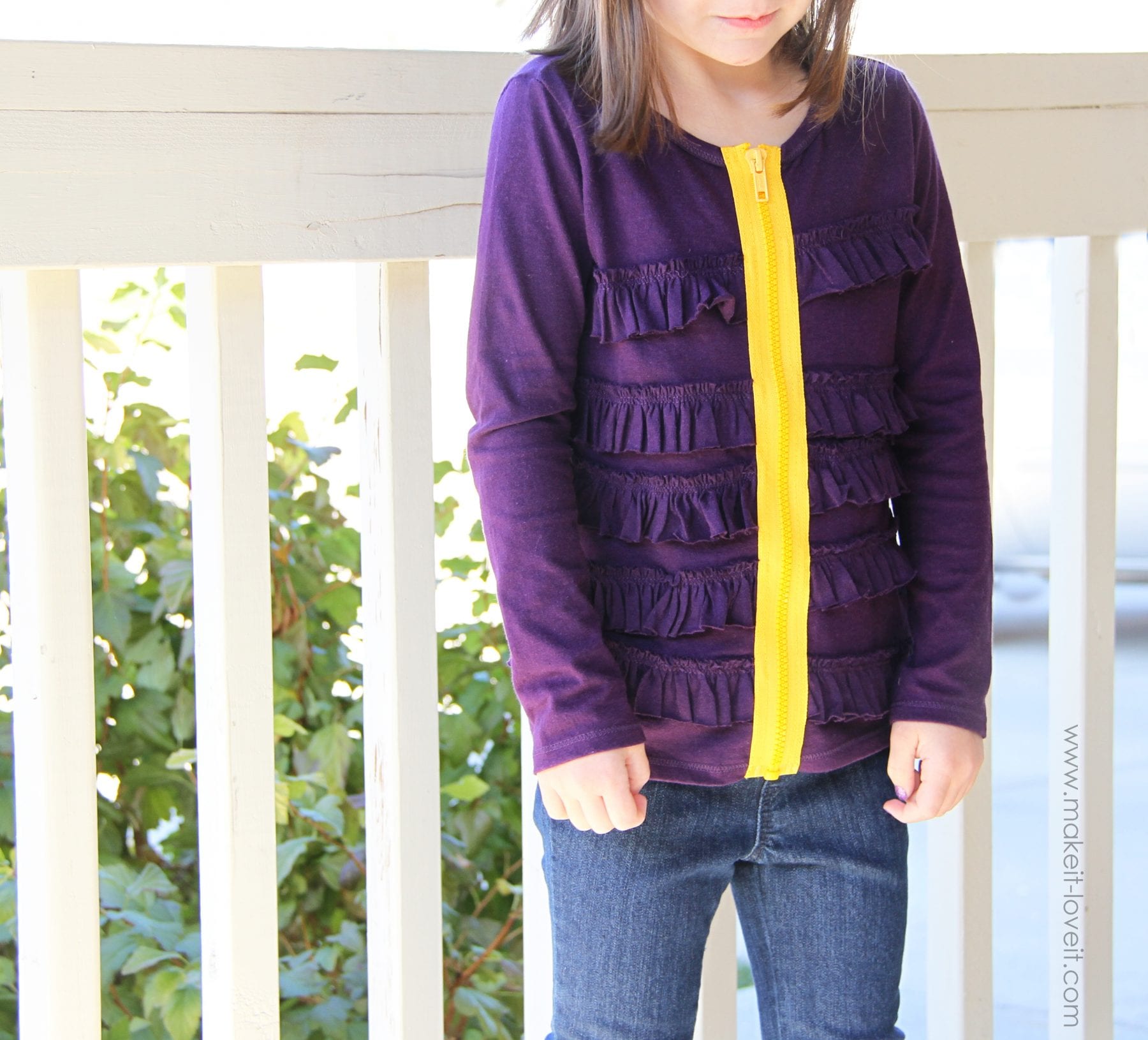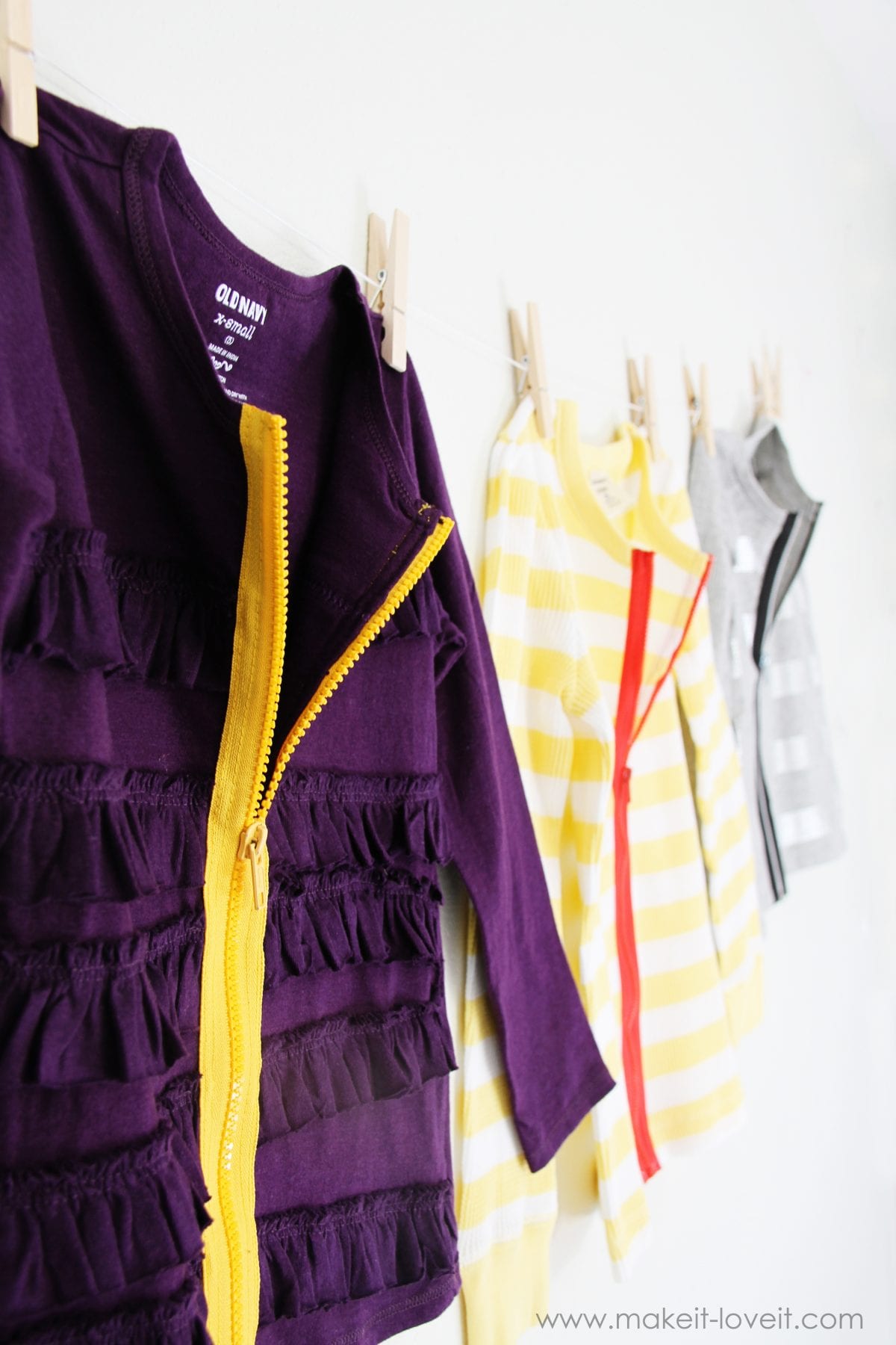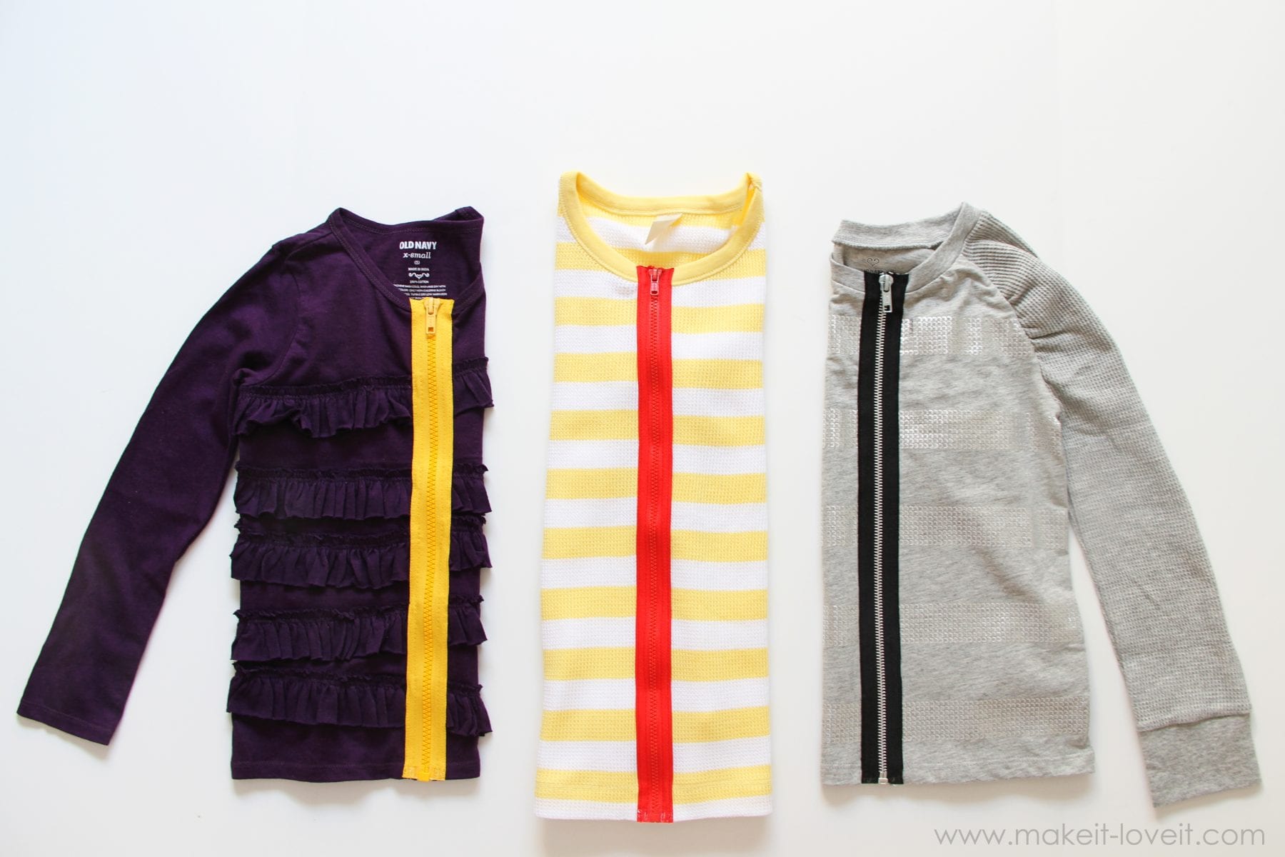 First of all, you will need separating zippers. They are the kind that open at the bottom, like a zipper for a coat. And make sure the zipper is at least as long as the front of the shirt……or longer. I bought my zippers at Joann’s. (Also, I bought all the shirts at Old Navy.)