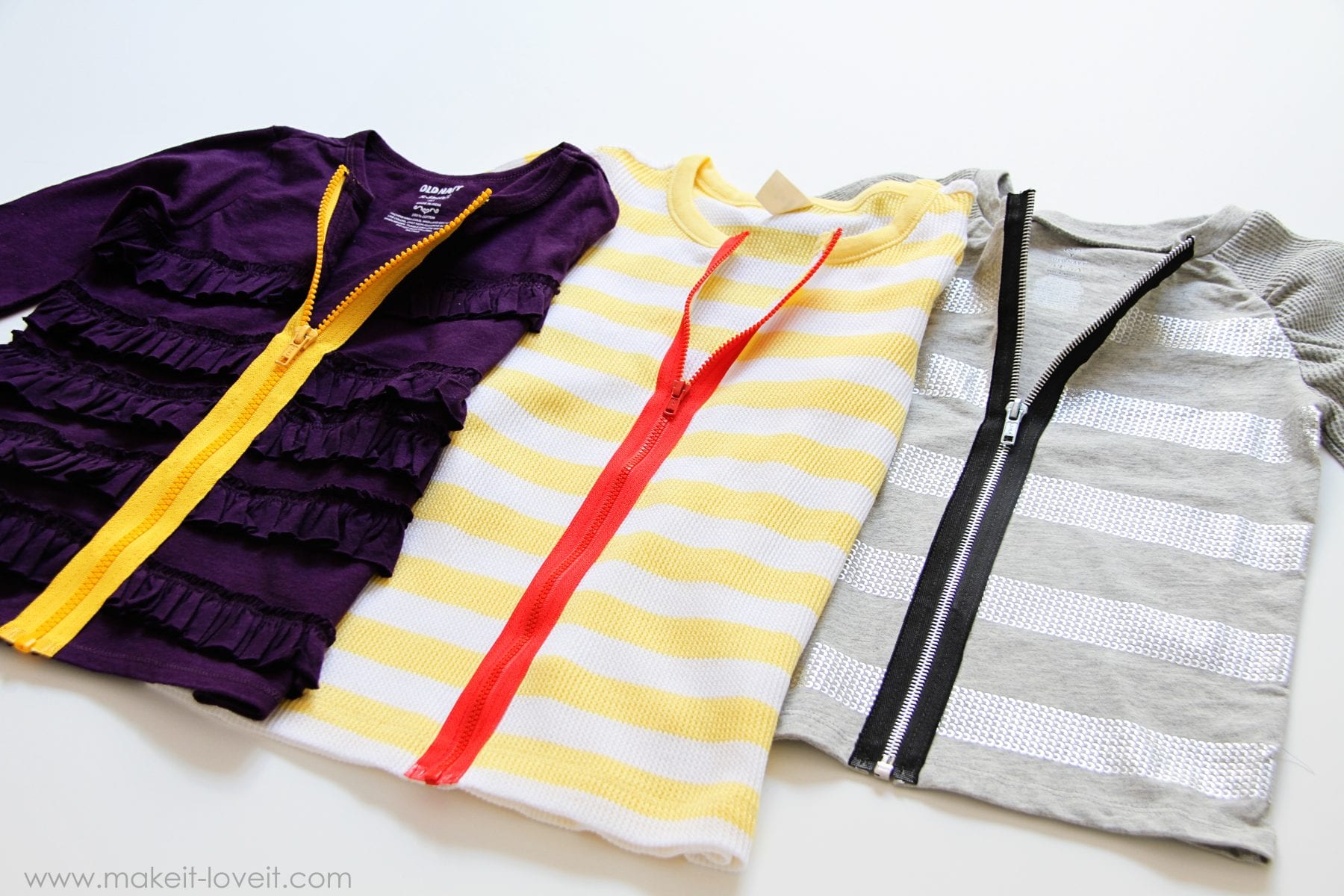 First of all, you will need separating zippers.  They are the kind that open at the bottom, like a zipper for a coat.  And make sure the zipper is at least as long as the front of the shirt……or longer.  I bought my zippers at Joann’s.  (Also, I bought all the shirts at Old Navy.)