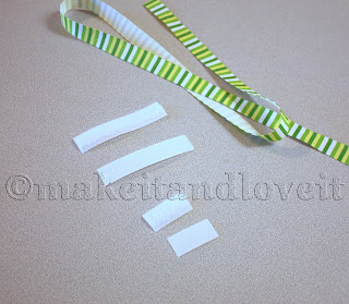 Heat seal the ends of your piece of ribbon (or webbing) or fold under and sew. (I use a lighter to melt the loose ends.) Then attach one piece of the 1 inch long velcro to the front side of one end of the ribbon.