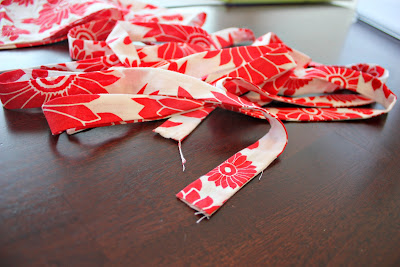 Then I folded the strips in half lengthwise, with wrong sides together, and sewed along the raw edges, using a 1/4 inch seam allowance.  Then I turned the tubes right side out and pressed them flat, with the seam along one edge.  (Need help with turning a tube right side out?  Click here.)