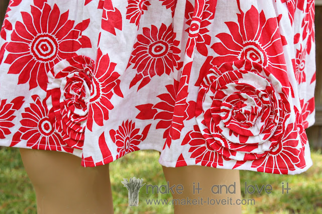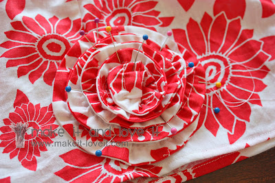 Then select where you’d like to place your flowers.   Begin making the first one by placing one end of the gathered tube down on the skirt and begin making a circle.  Cover the raw end with your circle and then begin winding inwards.