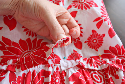 Then I moved onto the ruffle.  Since my skirt had 2 tiers remaining, I wanted to cover that seam with a ruffle.  So I began at one side and pinned the ruffle right over top of that seam……