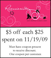 And that’s not all. Recessionista is offering a fabulous giveaway to all of you. Recessionista is offering a $50 credit towards anything. Yep, anything. And this is something that any of you are able to enter to win and can be mailed to you. (Or if the winner is local, the credit can be used at the party next Thursday.)