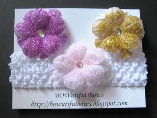Number 1: This Glitter flower set. This includes a 1.5″ crochet headband and three glittered flowers of your choice. Color choices are found here.