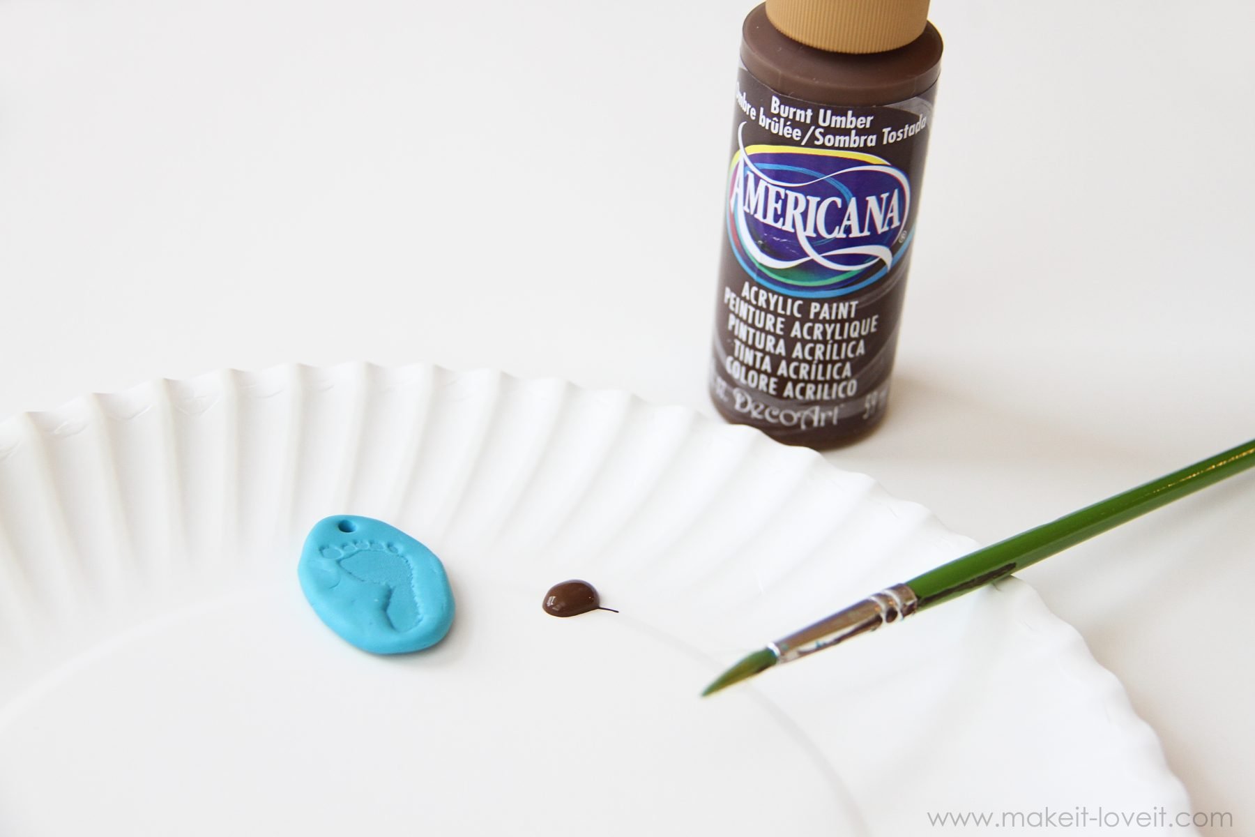 After it’s cooled, you can either stop here and apply your glaze or you can add some paint to give the imprint some dimension. I have seen several methods using paint to give your imprint some dimension but Then She Made mentions using brown paint and not black because black stains easier on the spots you don’t want it to. So I used brown and it worked great. I’m not sure what sort of paint she used, but I found that some of this inexpensive acrylic paint worked great. (But a reader emailed me to let me know that using stamp ink works great too. Great idea!)Â