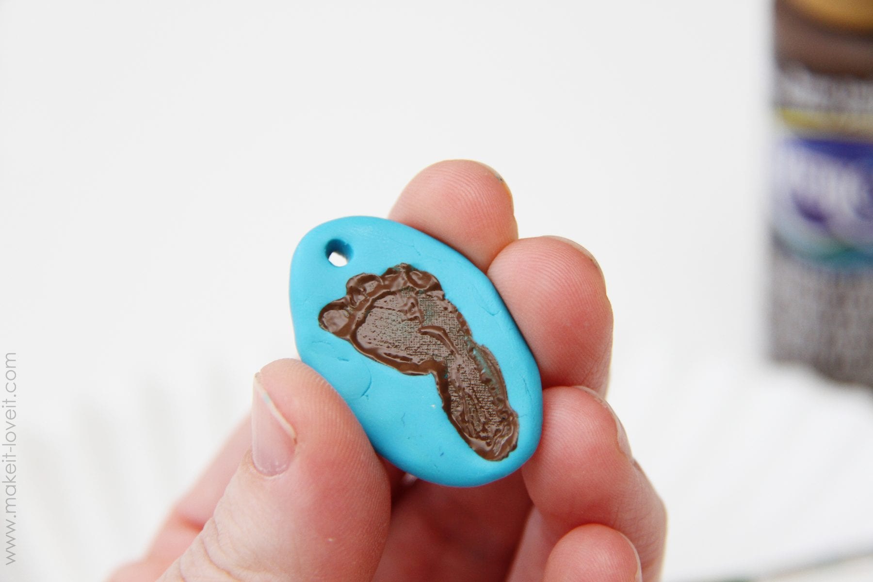 *****As a side note, if you are adding layers of colors (like I did with that baby hand and the fish bowl), make your imprints on their separate pieces of clay and then be sure to score your clay before attaching them together. What that means is that before adding on the blue hand, for example, I lightly scratched up the back of the clay with a toothpick and then I also scratched up the front of the green heart where the blue hand would go. Then I pressed the blue hand down on to green heart hard enough to attach it but not too much too squish the hand imprint. Scoring the clay gives it some texture so that they will stick together better. Then you can bake it just like normal and then paint and glaze it.