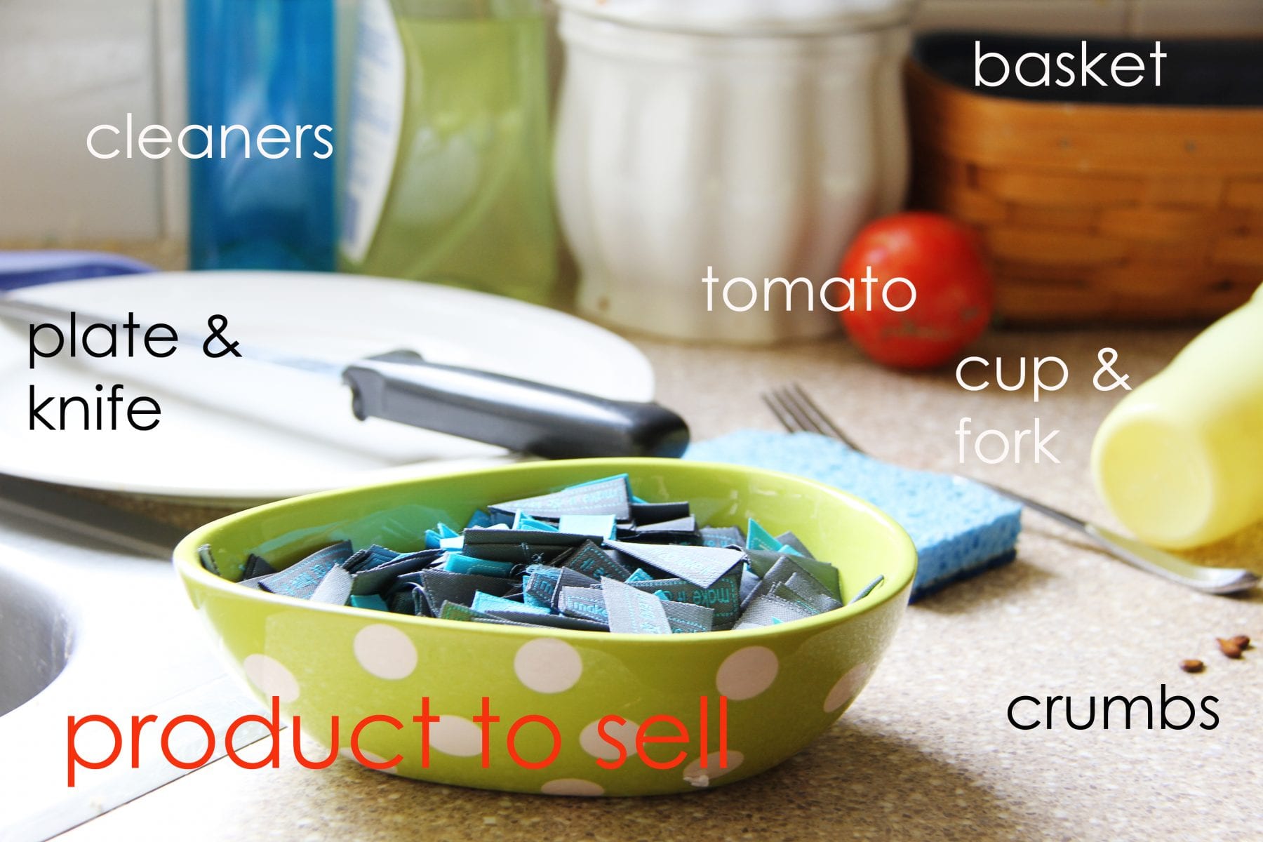 If you’re going to use the counter, that’s great. Just clear everything out of the background. Seriously, everything. But if you do want something else in the picture, make sure it corresponds with the product you’re selling. For example, I could place the green bowl next to my sewing machine, or next to some scissors and a stack of fabric. Just make sure it relates to the product. And is tidy.