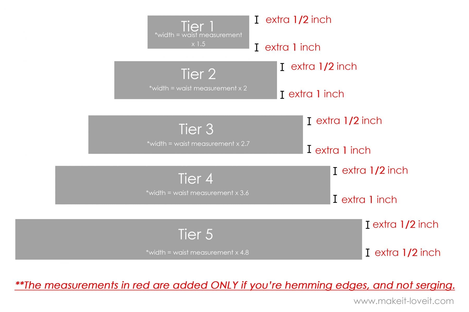 The first step is to decide how long you want the skirt, from the very top, down to the bottom hem. Once you know how long you want it, split that number by 5. For each tier, you will add a little extra to the top and bottom length, to accommodate for the waistband, the overlap, and the hem. And to figure out the width of each tier, you need to measure the waist of your model. The first tier width will be the waist measurement multiplied by 1.5. The second tier is the waist measurement multiplied by 2. The 3rd tier is the waist measurement multiplied by 2.7. And so on. I know, 2.7, 3.6, and 4.8 are strange numbers but it keeps the ratio even between tiers. Just go with it!