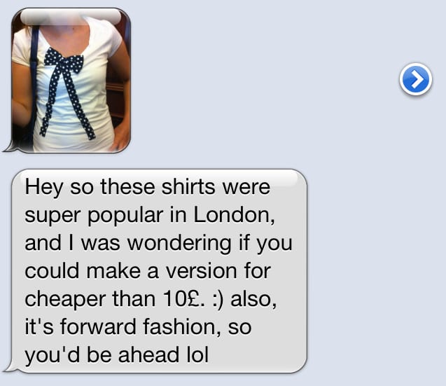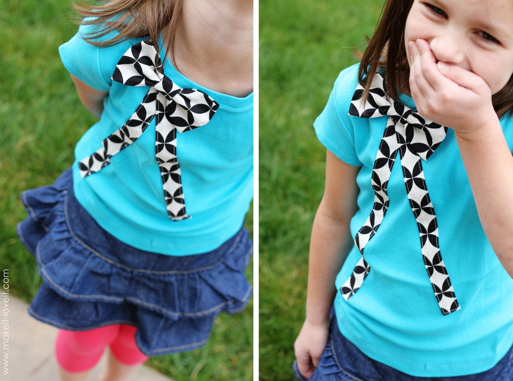 So now, anyone else who’s interested, will also have a really quick “fashion forward” bow shirt project to make for the weekend.  Or, maybe you want one for your little girl…..because while it’s totally cute on whoever that model is that my niece sent me a picture text of, it’s also really cute on the little girls. Thanks for the fun project idea Aubrey.  Now go find a sewing machine to use between calculus and pharmacology (okay, I have no idea what your classes are).  Seriously, this will take you 20 minutes.  Maybe 30.  And then send your proud auntie a picture.  Deal? :)