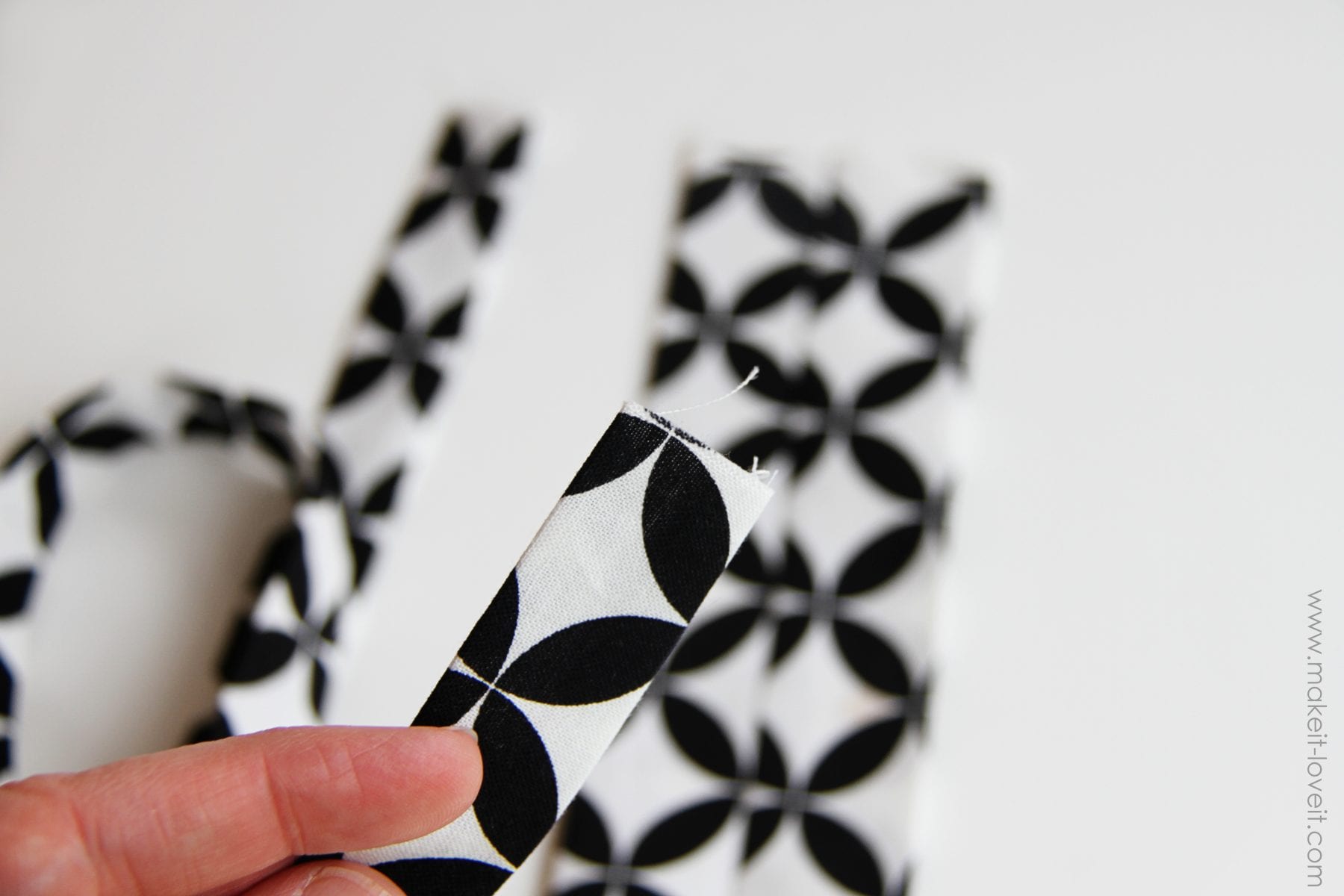 First, fold the strip in half lengthwise and with right sides together.  Then sew along the long side, sewing it into a tube, using a 1/4 inch seam allowance.  Then turn right side out and press.  Do the same thing with the larger piece of fabric.  For the skinny strip, I placed the seam along the side of the strip and then ironed it flat.  For the larger one, I centered the seam along the back.  (Need help turning a tube right side out?)