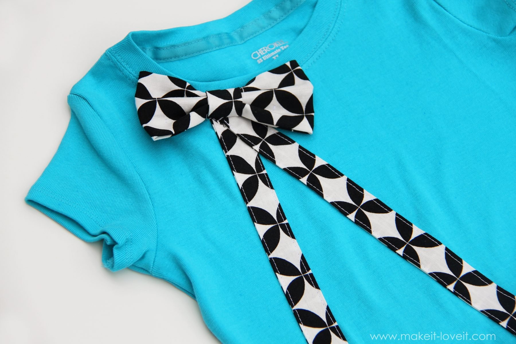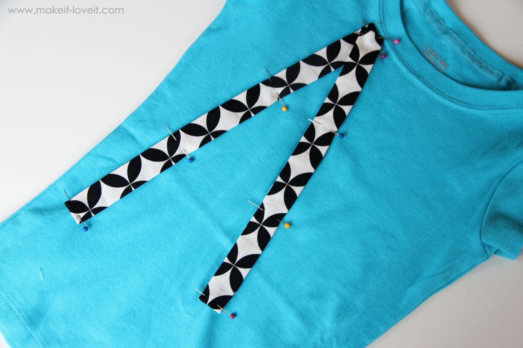 Then place your bow tails on your shirt and your bow and position them just how you’d like them.  Then remove the bow and pin the bow tails down in place.  Tuck under each end about a 1/4 inch and pin those down as well.