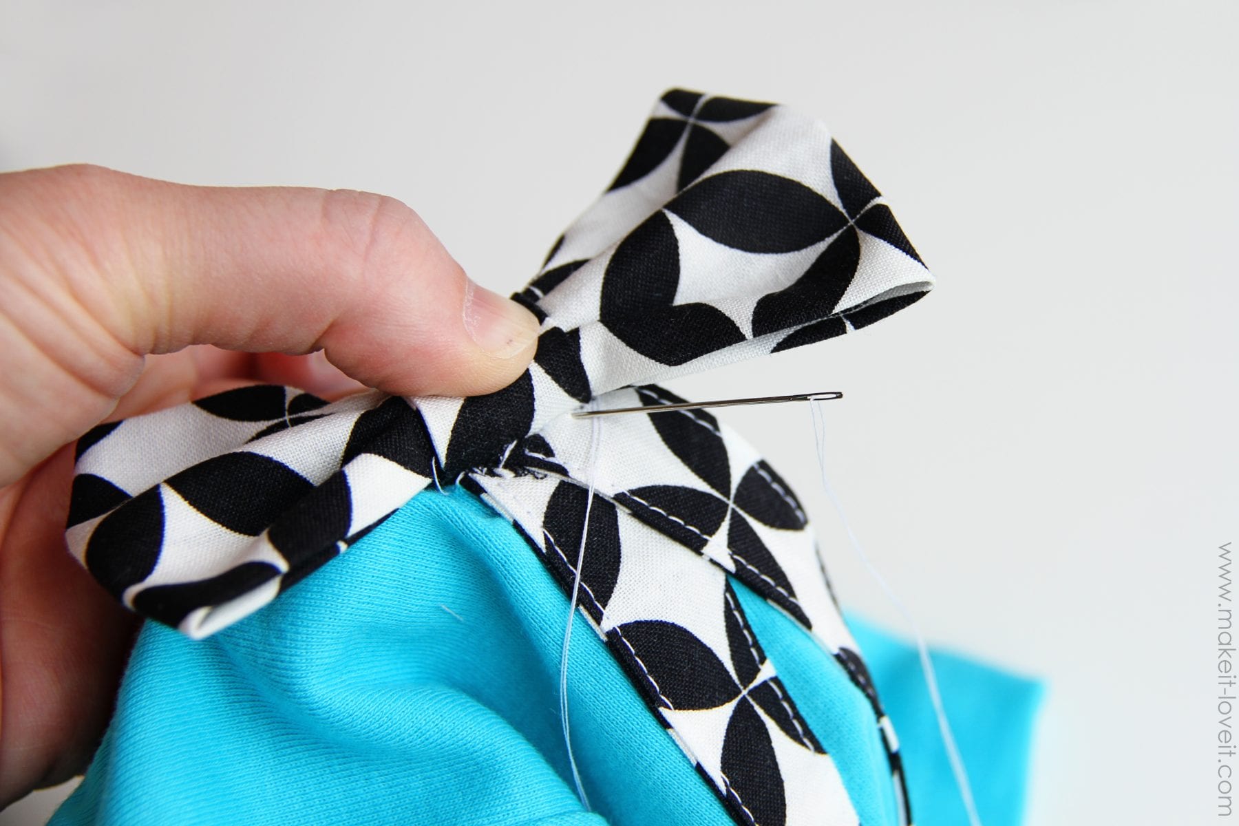 Lastly, and this is optional, but I secured the bow ends just a bit by tacking them down with a couple hand-stitches.  I just figured this would help keep the bow in place when it’s washed and such.