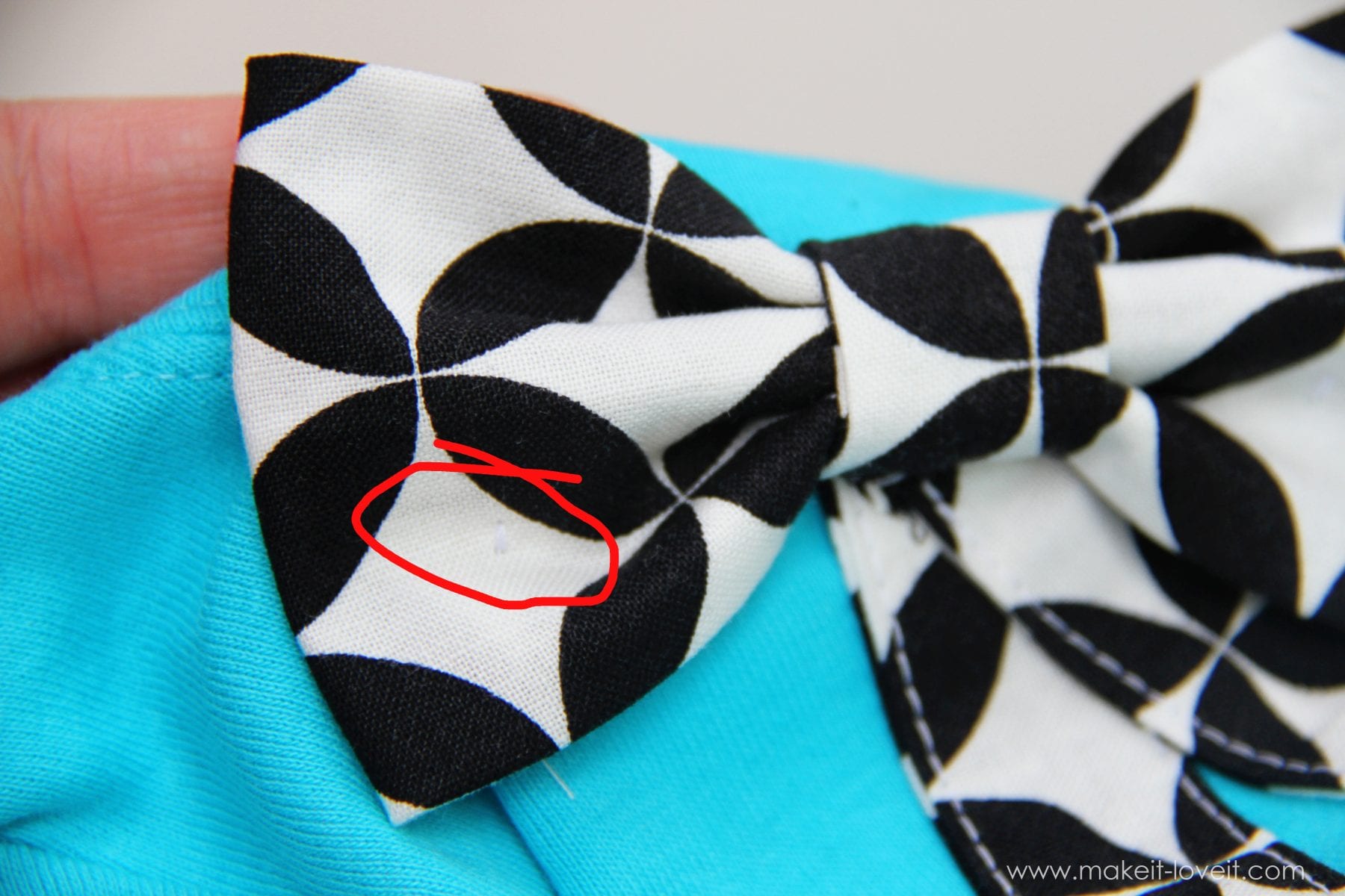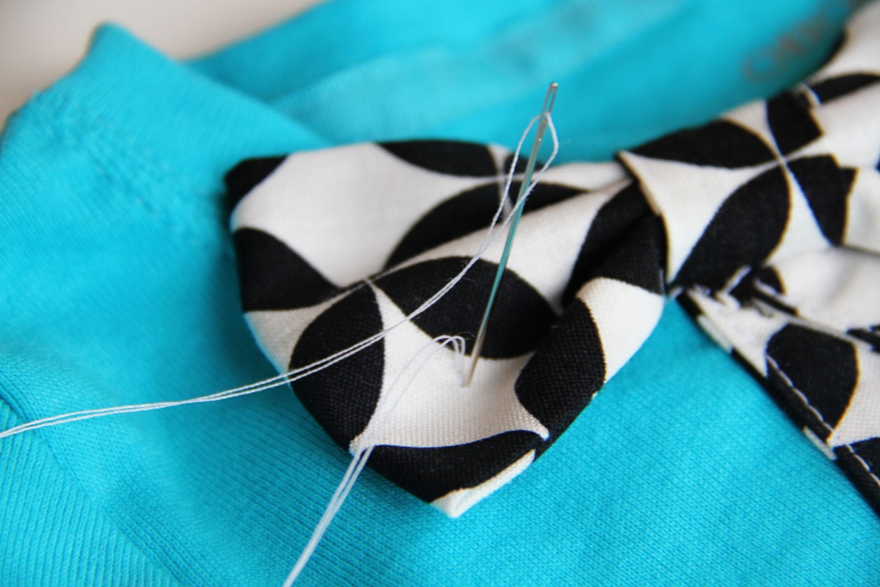 Then place your bow down and hand-stitch the bow right to your shirt, trying to keep your stitches hidden.  (Need help with hand stitching?)