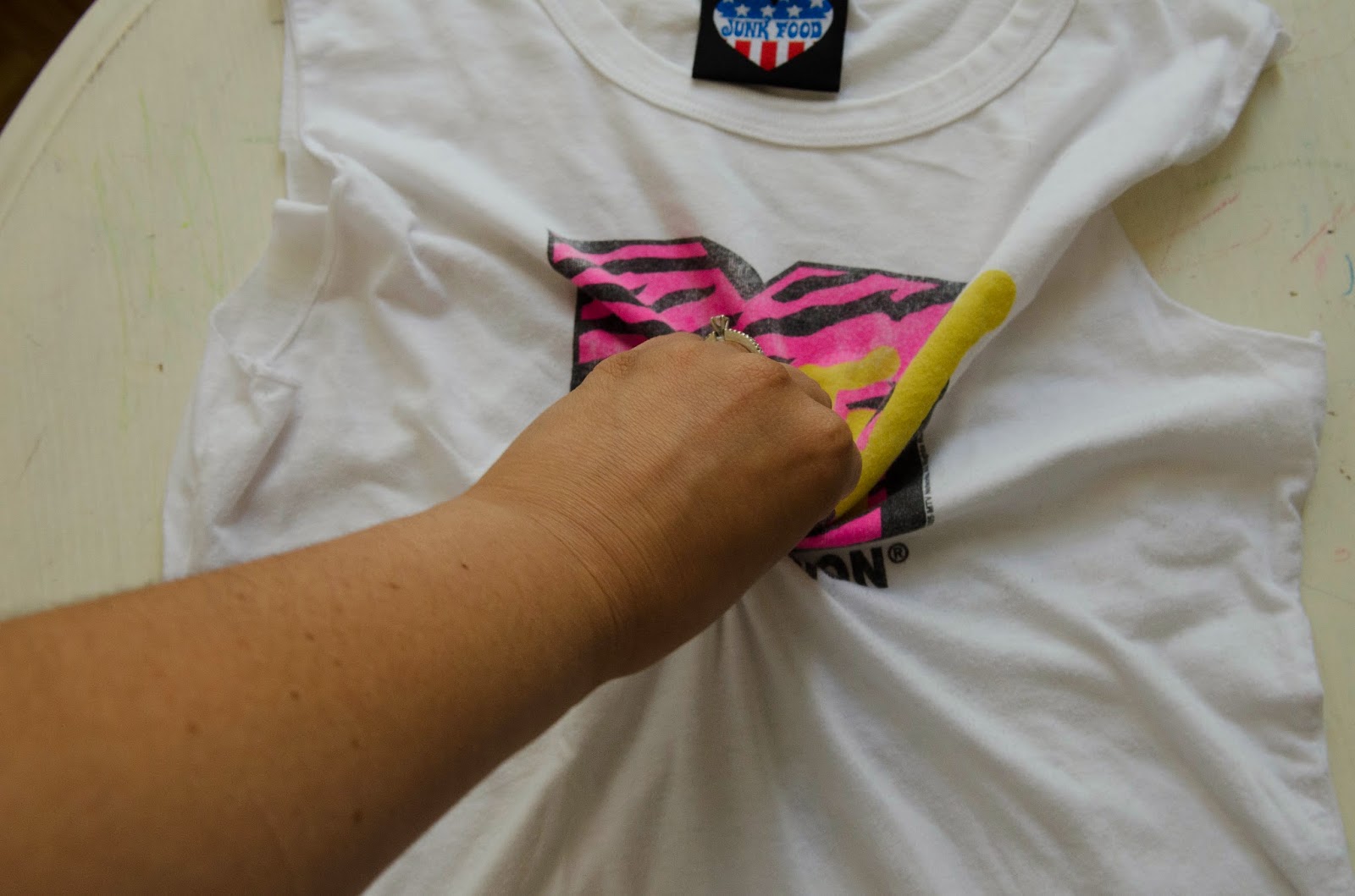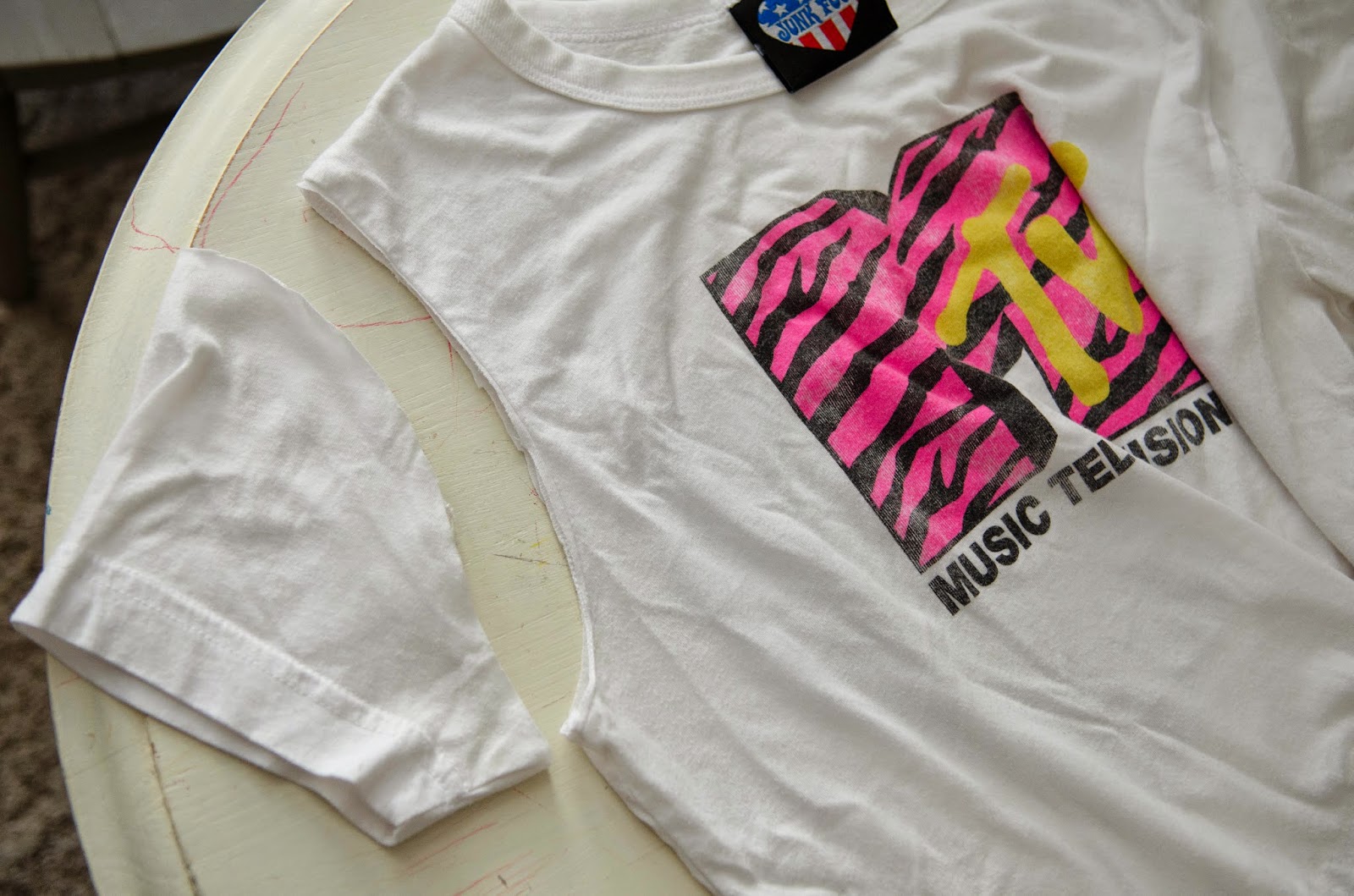 Okay, so for all three of you perfect human specimens that actually clean out and get rid of every single out-dated item in your drawers you will need to make a trip to your local thrift shop. If thrifting isn’t your thing, then by all means head to the clearance section of your local department store and pick out smaller adult t-shirts for kids or larger ones for an adult. You could also raid your pre-teens drawers for tops that are sooooo last season. ;) Once you have the goods you will need to chop off those sleeves! There is no perfect way to do this, just remove the sleeves. Anywhere you cut will be just fine, since these Tshirts are made with knit fabric and won’t fray. But I just cut right along the seam of the sleeve.
