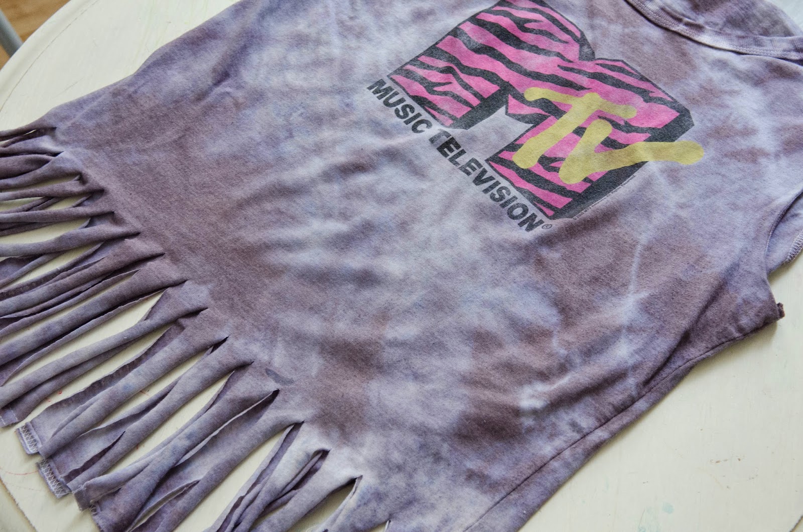 I only let it sit for about 45 minutes before removing the rubber bands and rinsing it with cold water. I then threw it into the wash, by itself. Once it was dry I trimmed off the bottom hem and cut vertical lines into the bottom of the shirt about 4 inches high: