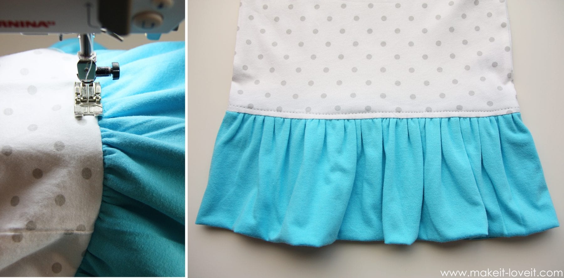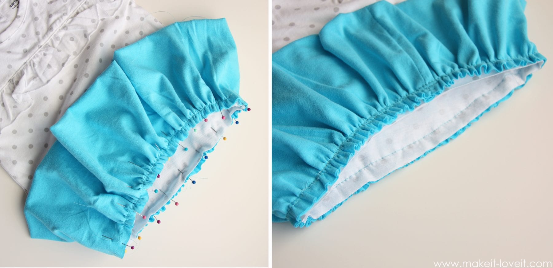 Now gather up the skirt section and evenly space it along the bottom of the onesie, matching up raw edges. Pin in place and then sew. TIP: Increase your stitch length just a bit while sewing, to prevent stretching and pulling.