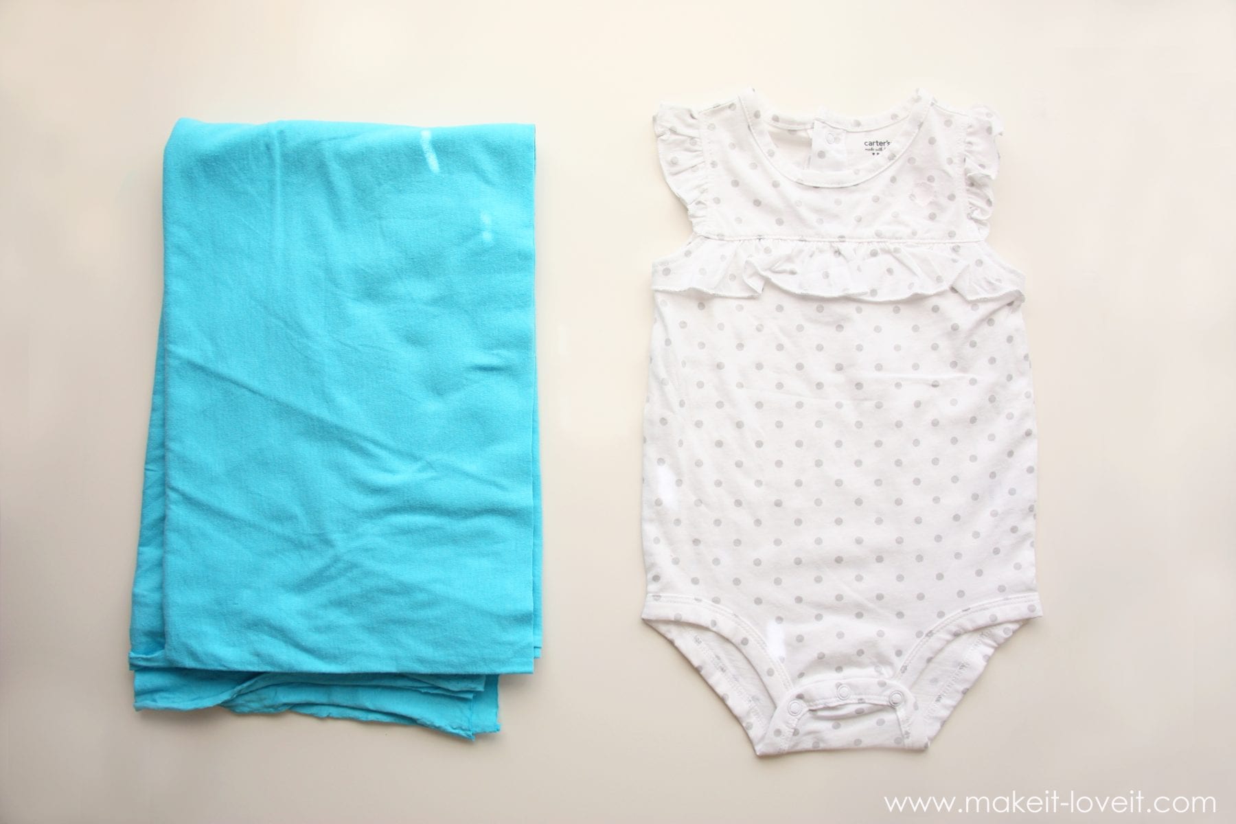 Grab a onesie from your baby’s drawer. Or even go and buy one. They are a really great base for making a bubble dress. Then decide on your coordinating fabric for the bubble section of the dress. (I found this teal knit at Hobby Lobby.)