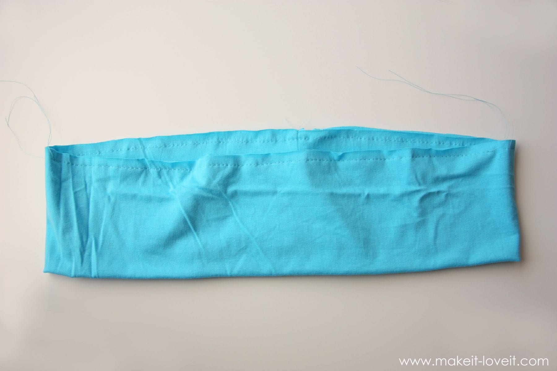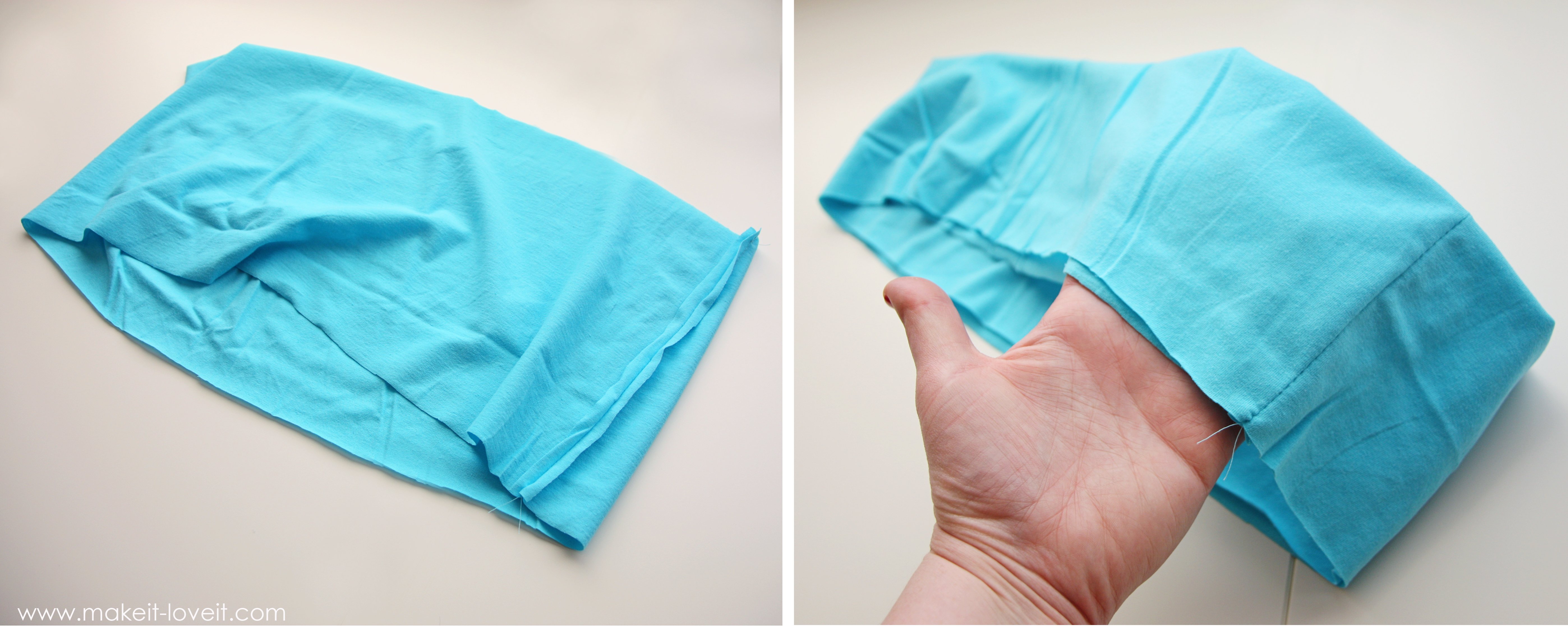 Then, fold the strip in half width-wise, with right sides together, and sew the two ends together (shown on the left). Then, fold that circle in half inside itself, with the right side facing out, matching the raw edges together (shown on the right).