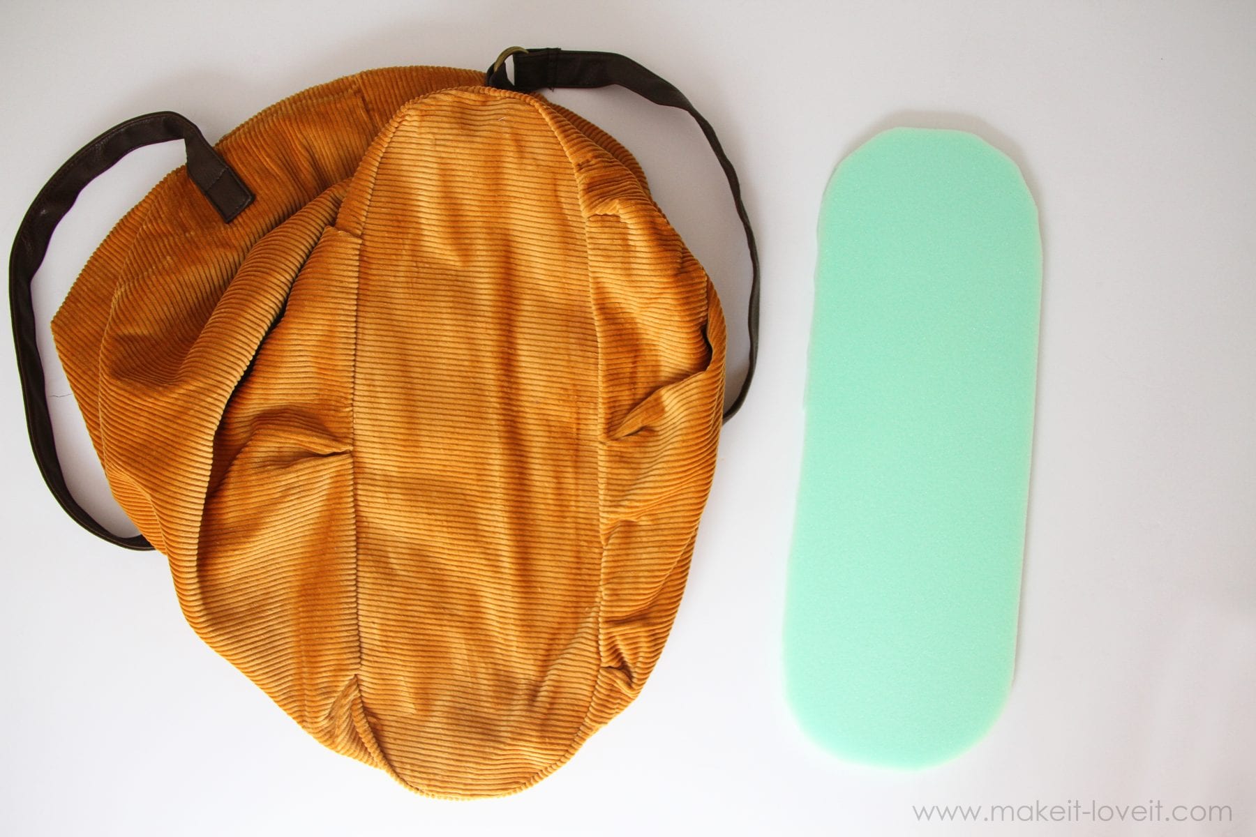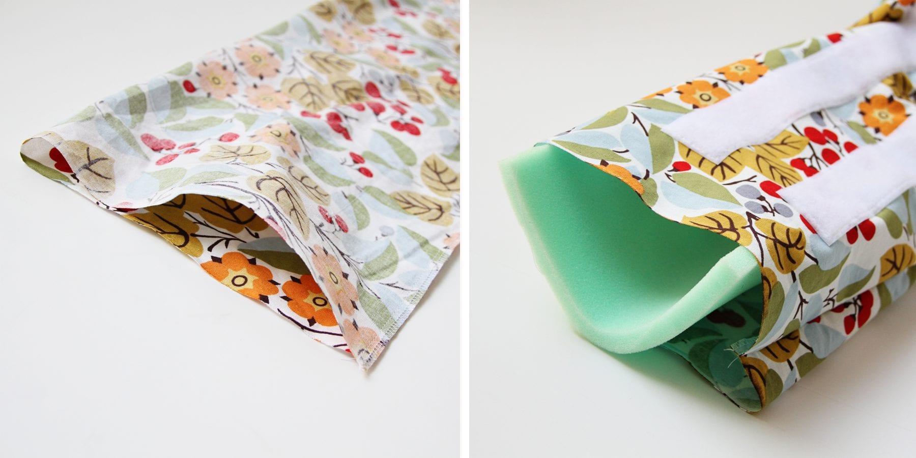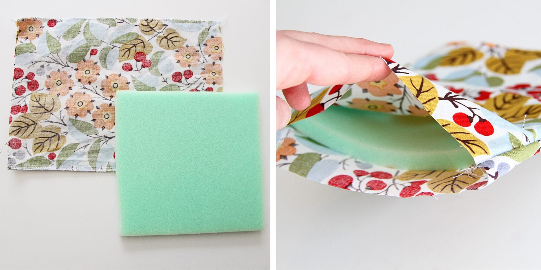 Then fold this fabric in half length-wise (with right sides together) and sew into a tube (using your 1/2 inch seam allowance). Then turn it right side out and maneuver your foam inside. Like I mentioned before, folding the foam in half and then sliding it in there works best. But then wriggle it around in there until it’s nice and flat and the side seam is along the bottom of the foam.