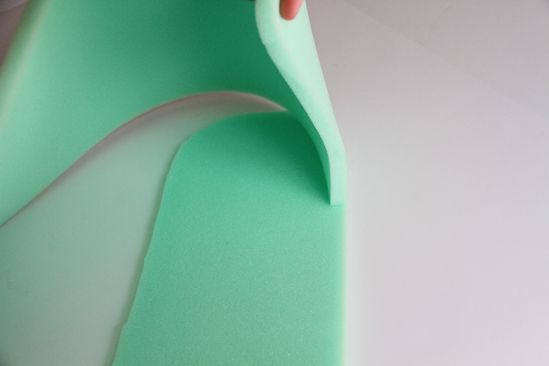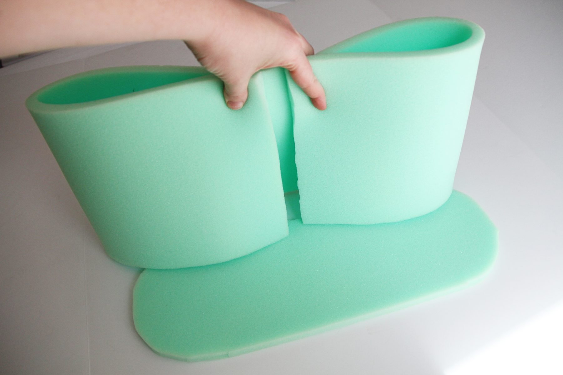 Then you’ll have a nice strip of foam that will make the walls of the foam insert. However, cut about an inch off of one end because after you add the fabric, you’ll be sewing those two ends together with their extra fabric ends. And you don’t want to have to sew through foam. (This will make more sense in later steps.)