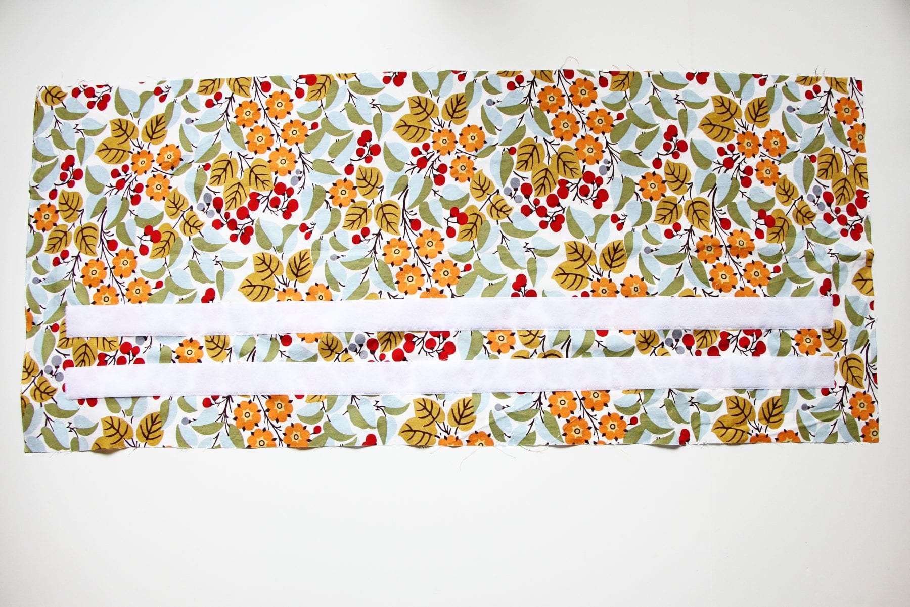 For the bottom piece of foam, you will need 2 layers of fabric that are a 1/2 inch wider than the foam piece, around all edges. (A 1/4 inch is for the seam allowance and another 1/4 inch is for the foam thickness.) Just lay the foam down and cut around it. For the long strip of foam, you can either cut 2 pieces of fabric and sew them together into a strip (but then you’ll have 2 seams) or you can cut one strip of fabric and fold it over into a tube of fabric and sew it, resulting in only one seam. I only wanted one seam, so since my foam is 8 inches tall and is 1/2 inch thick, I needed my fabric to be 18 inches tall to wrap around the foam. (8 inches tall on the front + 8 inches tall on the back + 1/2 inch foam thickness at the top + 1/2 inch foam thickness at the bottom + 1/2 inch seam allowance + 1/2 inch seam allowance). My foam strip was about 37 inches long but I added another 2 inches at each end, so that I could later tuck the ends in and sew the foam into a tube. So cut my large fabric strip 41 inches wide by 18 inches tall. (Below it is folded in half under the foam.)