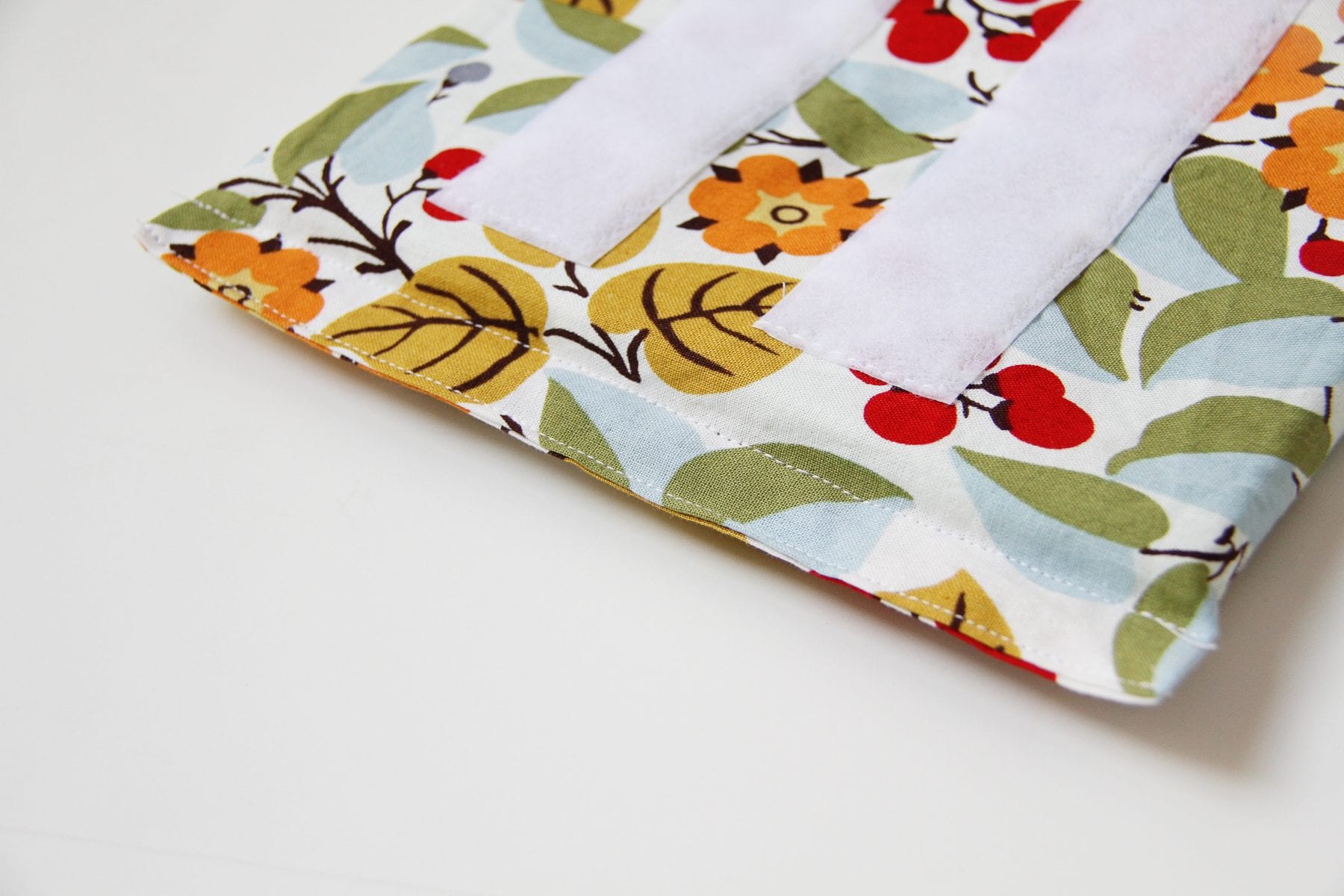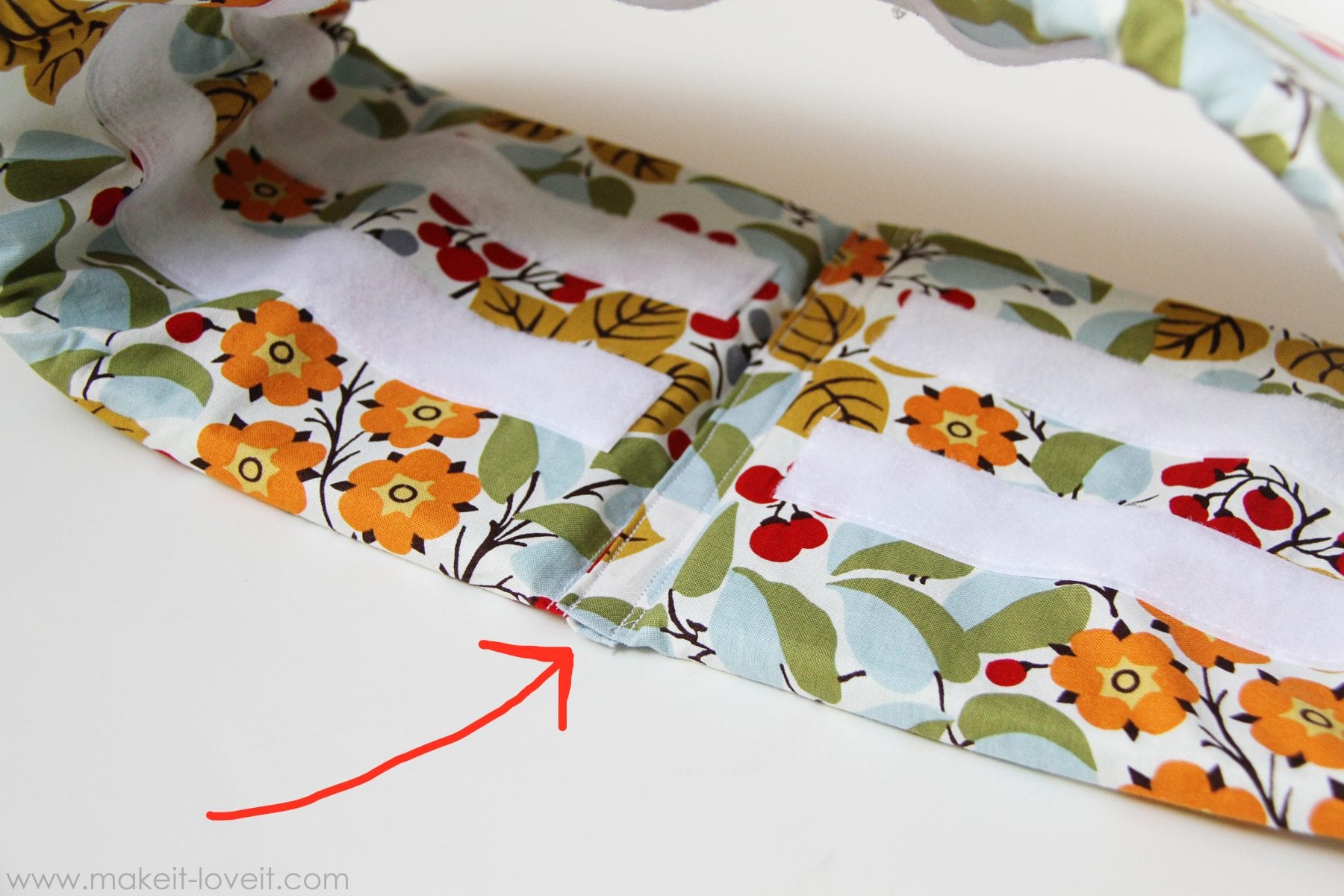 Next, I turned the ends in a 1/2 inch and sewed them closed with 2 seams, just like I did above with the bigger foam strip. Then I cut some of the other half of the 1.5 inch wide velcro strips, into more narrow strips to fit the flaps on each end (about 3/4 inch for me). Then I sewed the velcro right onto each end flap of the foam insert. Both on the same side of the insert. Do the same thing with your other foam insert (or more if you decide you want more inserts).