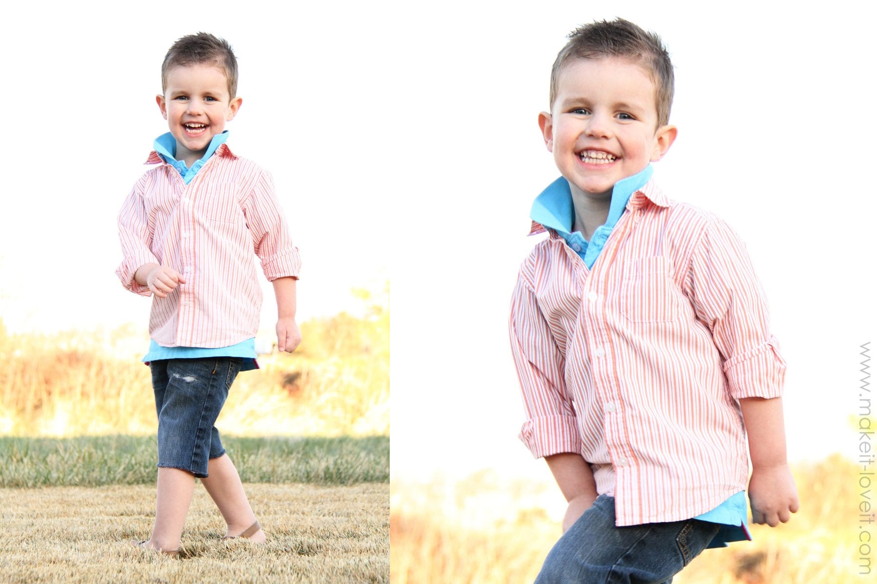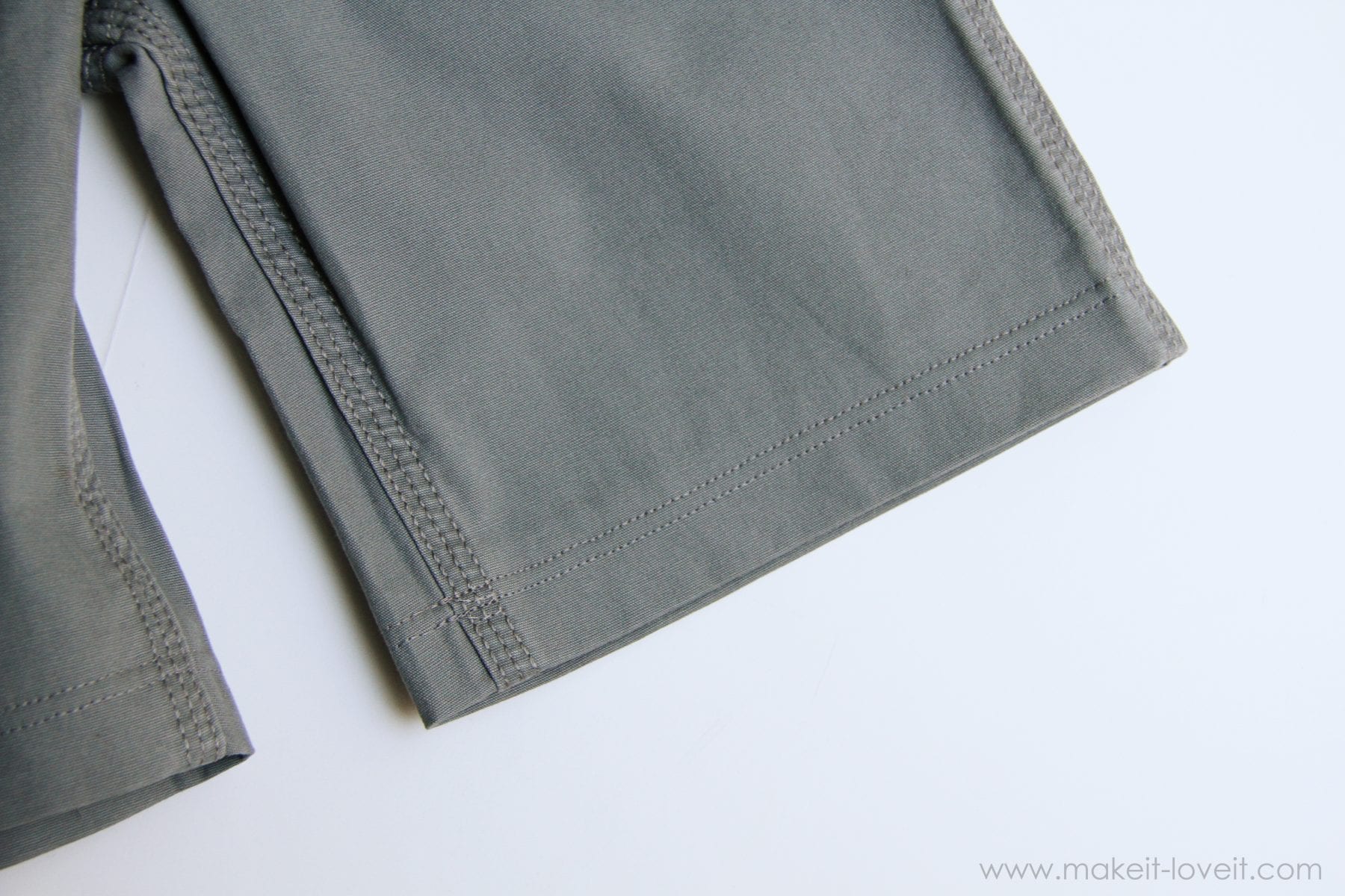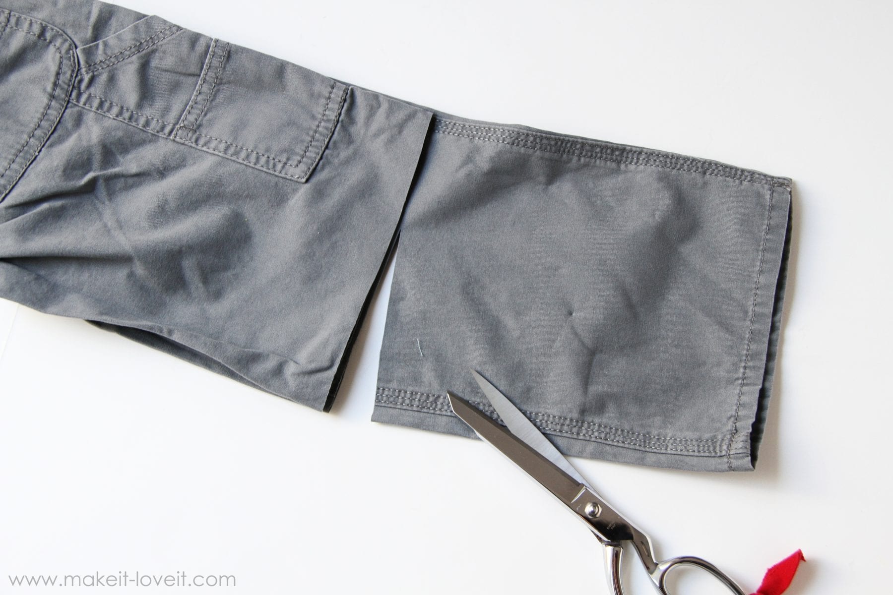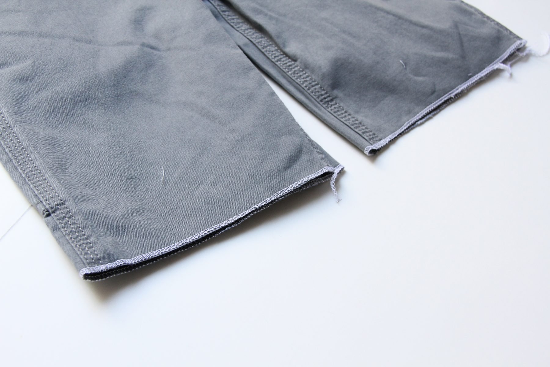First of all, decide on the length that you want. For boys, I like them around the knees or a little longer. And since it’s early in the season, I want them to be long enough until the end of the summer. So I went with “plenty long” in length. The easiest way is to set a pair of shorts on top of your pants, that already fit your subject. Then add an extra inch to that length and then cut.