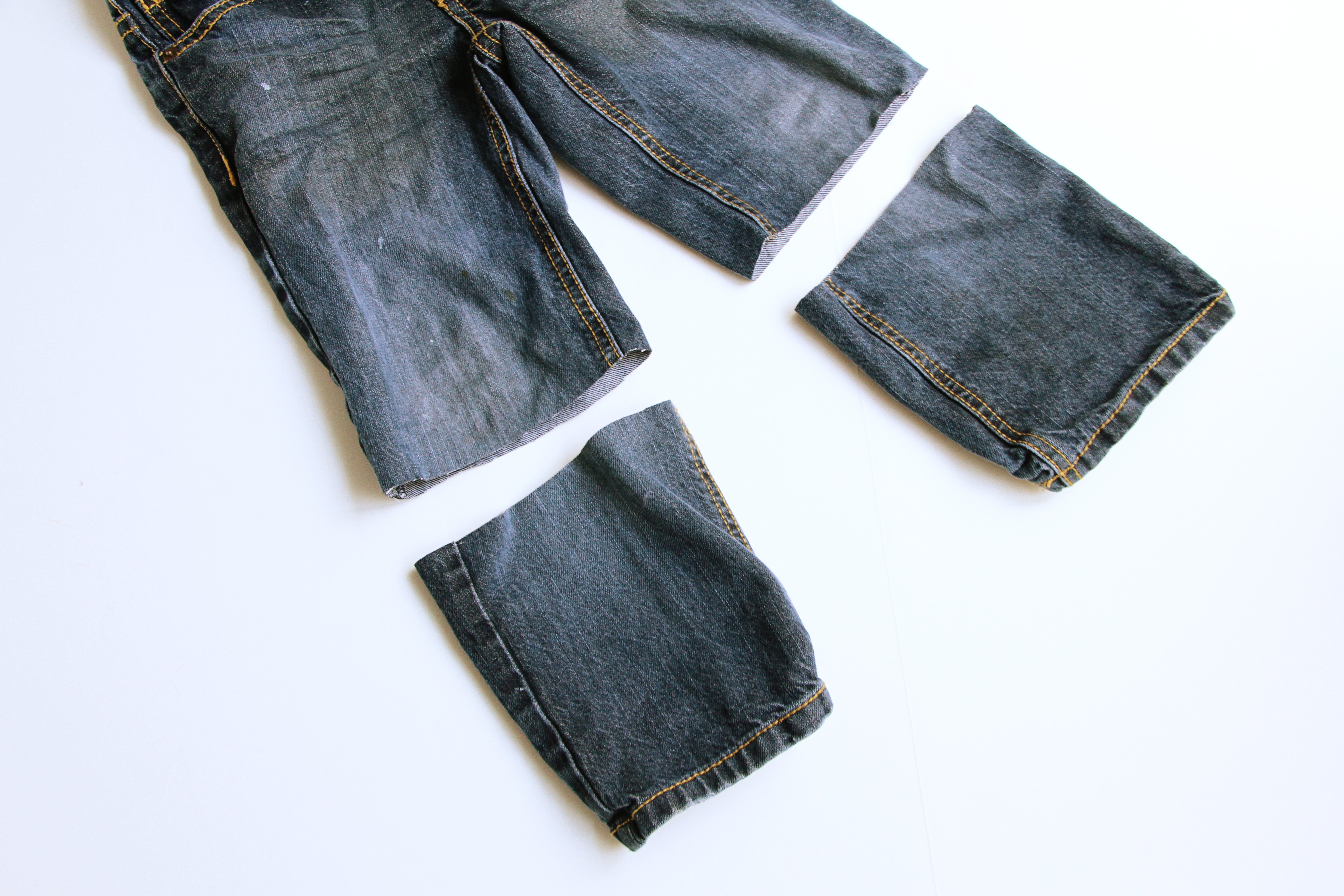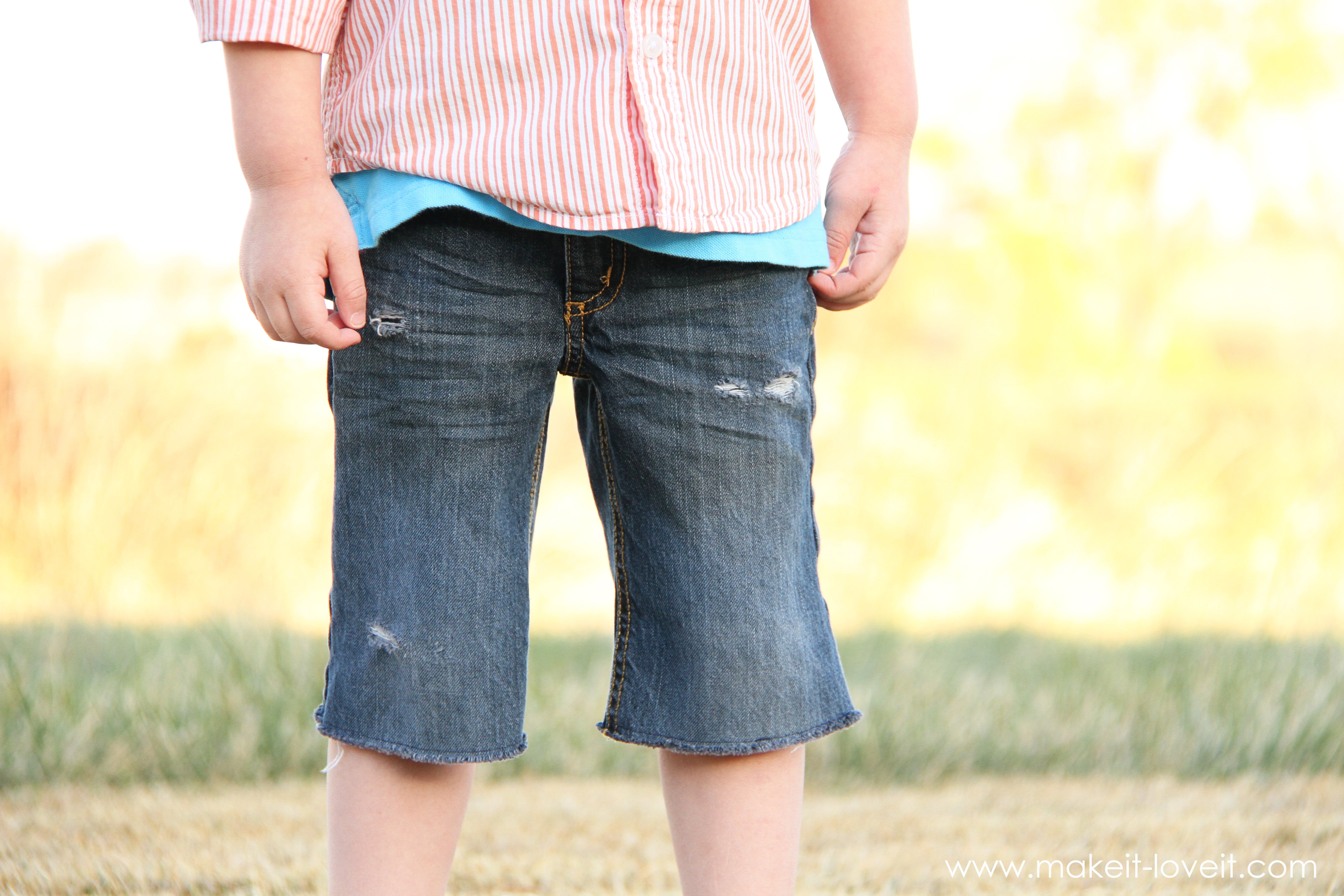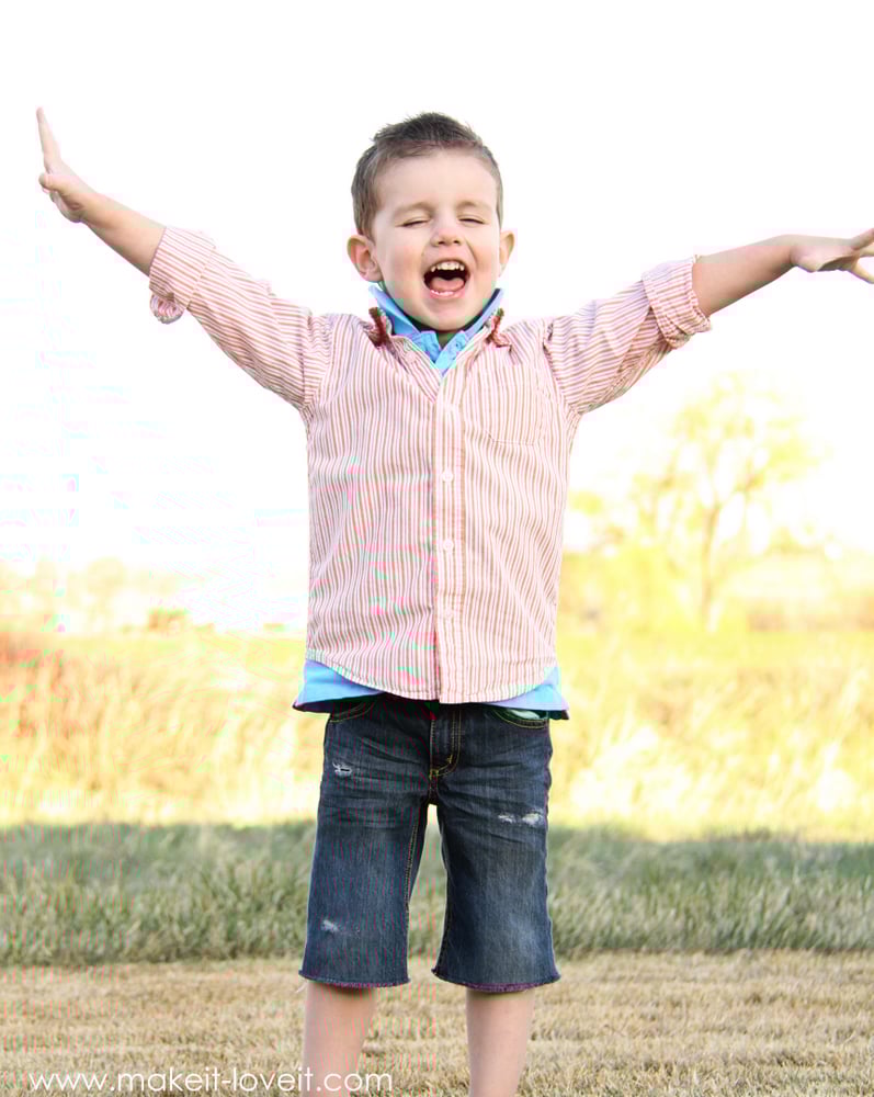 I’m sure you have mounds of long pants with holes in the knees, maybe some pants that are outgrown in length and are now high-waters, or hand me downs that are just now fitting but it’s the wrong season to wear them. Don’t get rid of them…….use them!