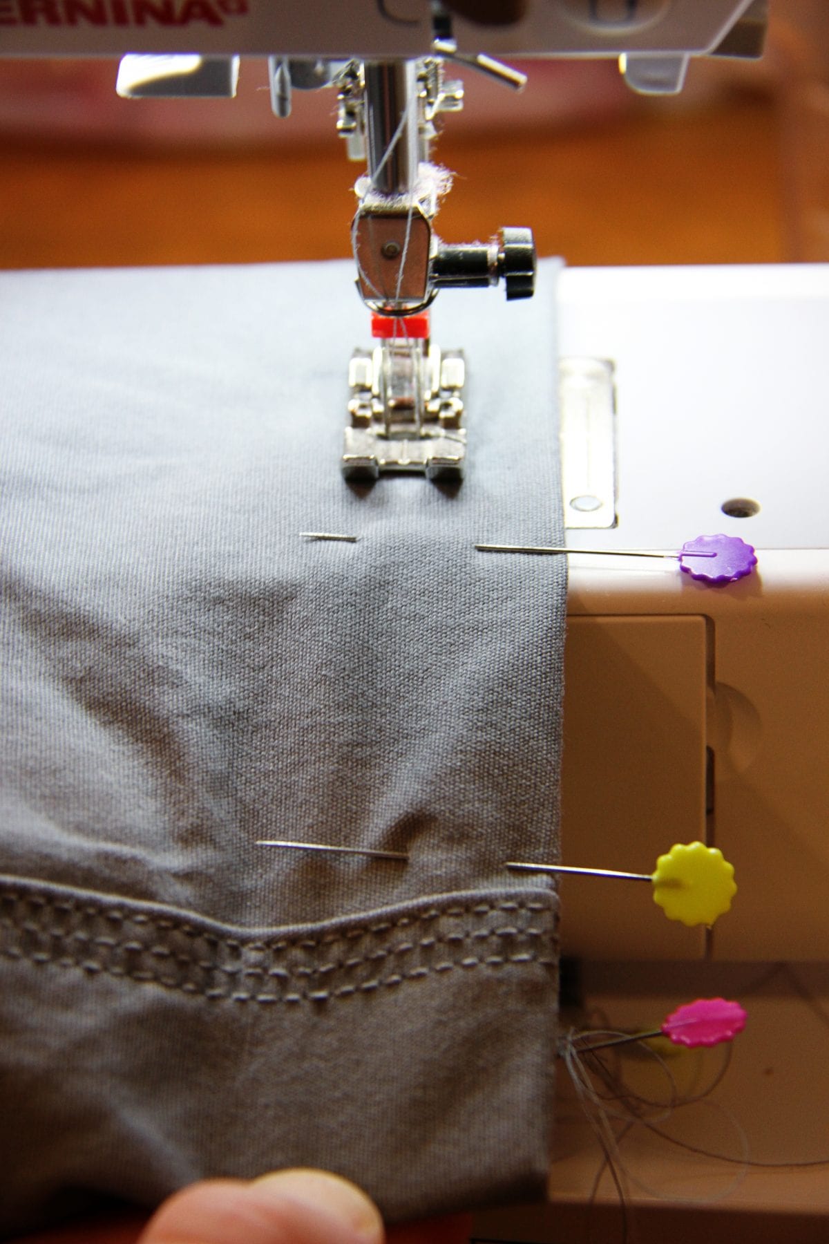 Then pop in your double needle and use about a 3/4 inch seam allowance. Remove the pins as you go……and remember that you can backstitch just like normal with the double needle. (Need help with the double needle? Click here.) However, if you don’t have a double needle or don’t like using one……..just create 2 seams right next to each other, about 3/4 of an inch from the bottom.