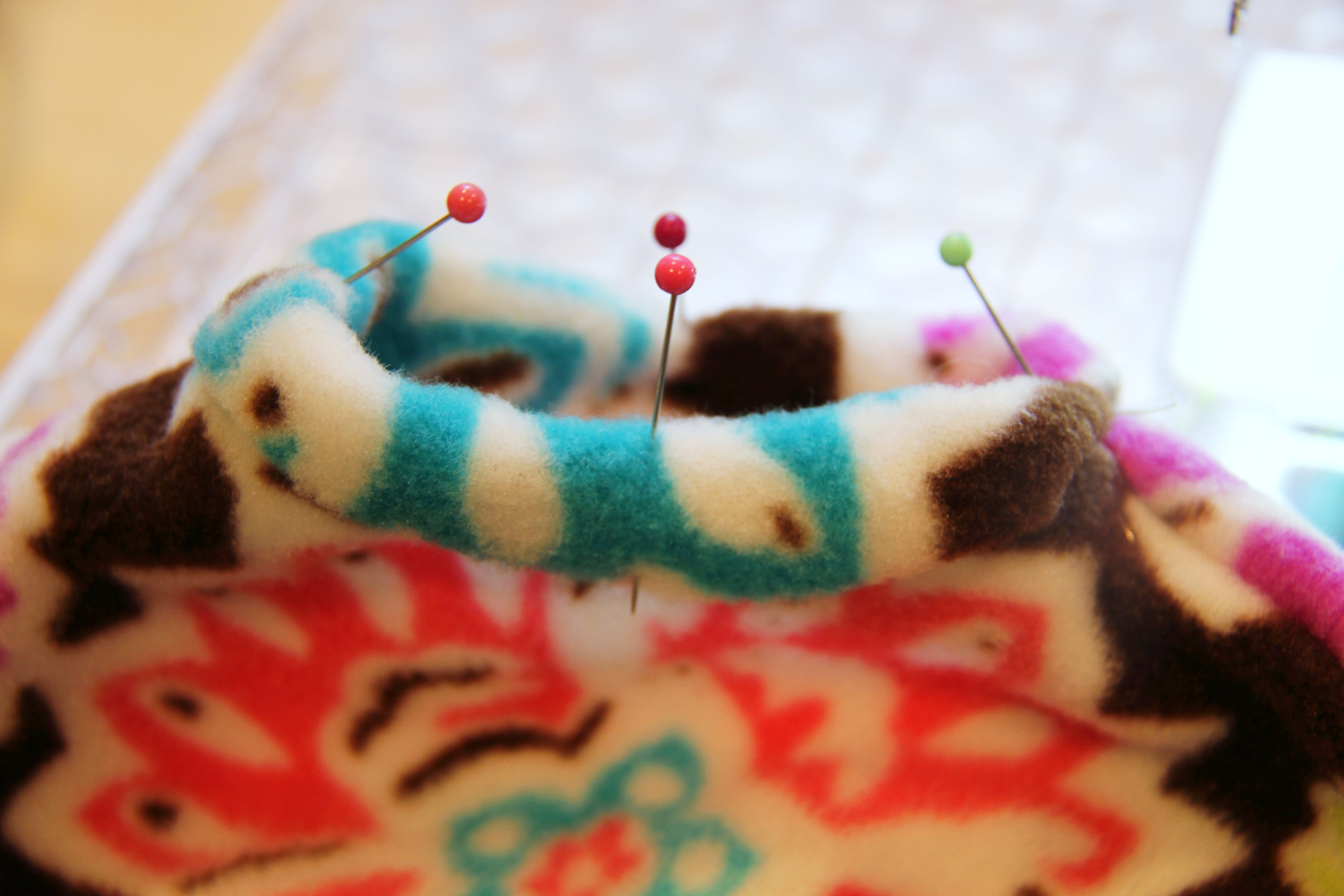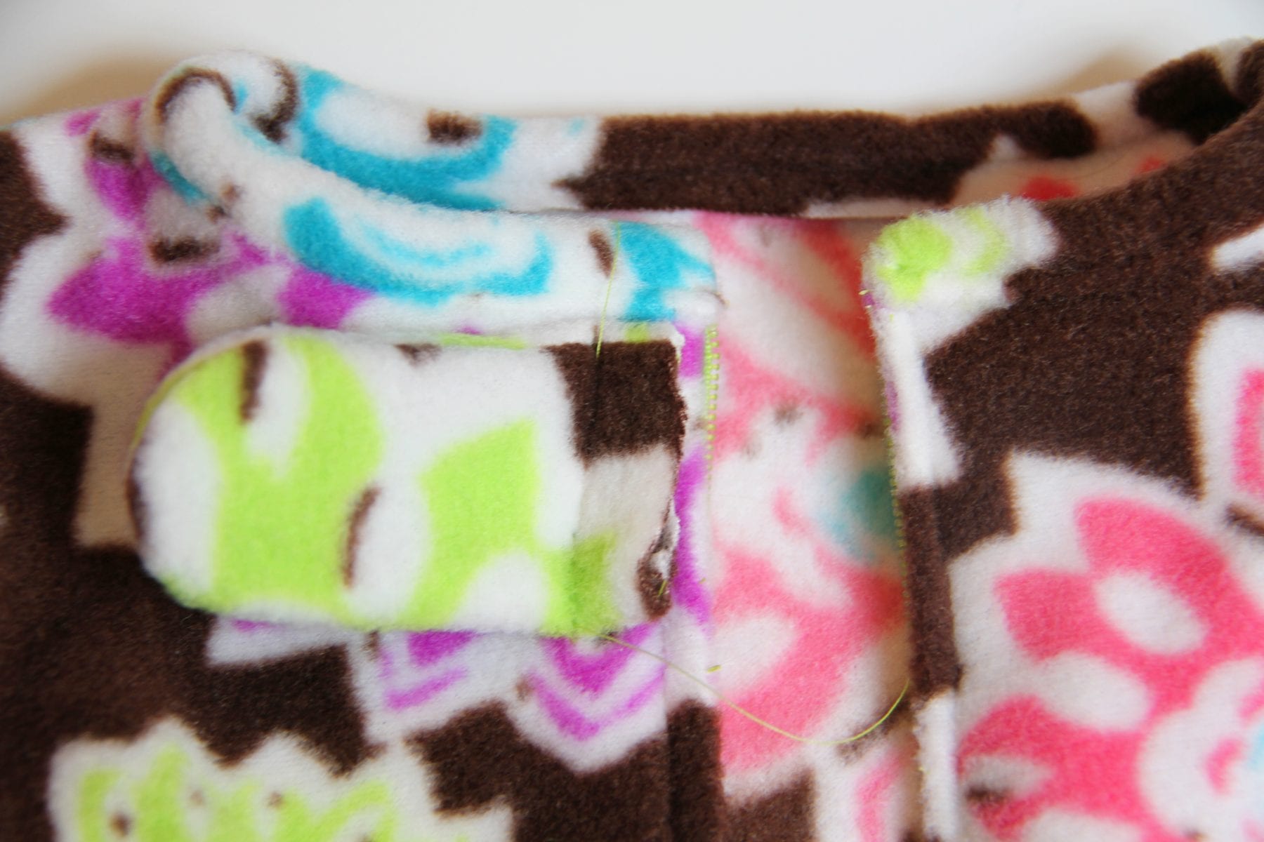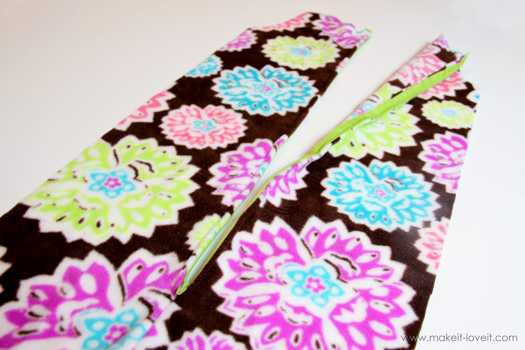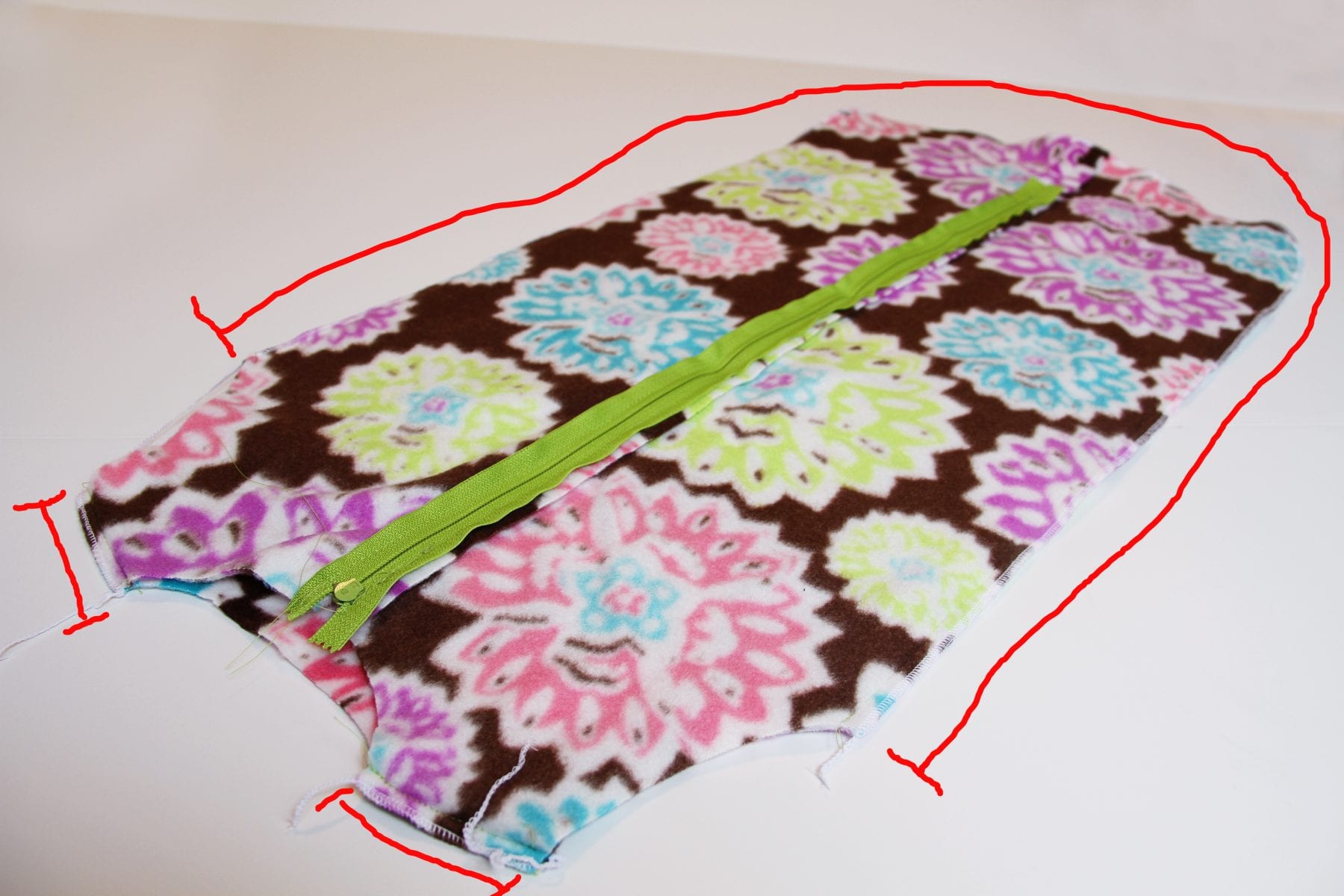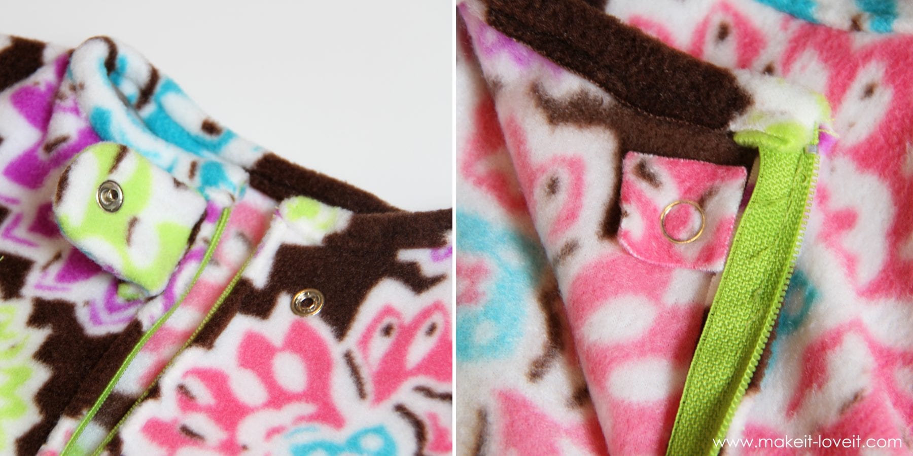 Turn right side out and then sew the snap tab right to the blanket, right below the neck line and next to the zipper.