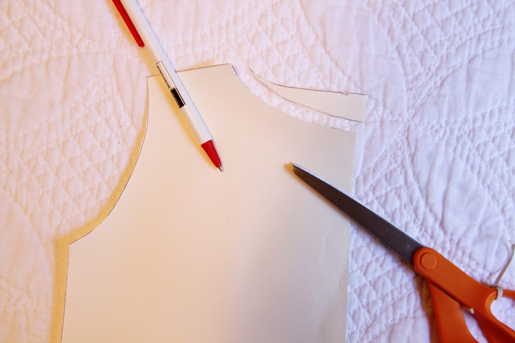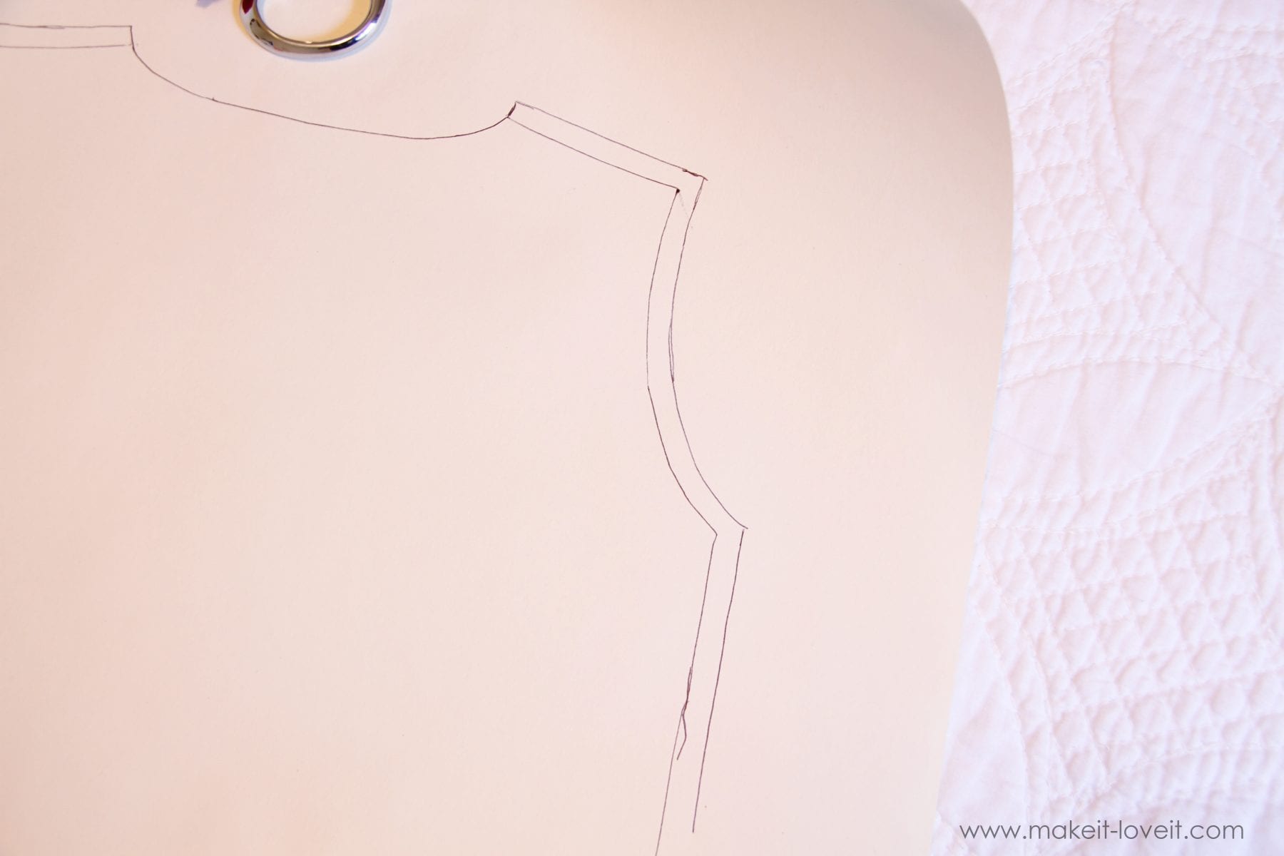Now, fold that back piece in half (or use it how it is if you only created a half pattern piece for the back) and place it along the straight edge of your paper……but place it about 1/2 of an inch from the edge. You need some extra fabric here for the zipper. Now trace around the entire thing, adding on that 1/2 of an inch along the long edge.