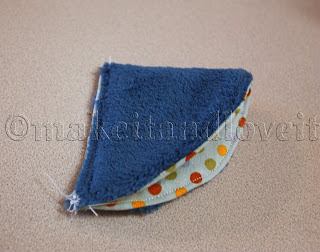 Then fold your half circle in half, with right sides together. Sew right along the raw edges, with another 1/4 inch seam allowance. Then sew another seam, using your zig-zag stitch. Trim any edges if necessary.