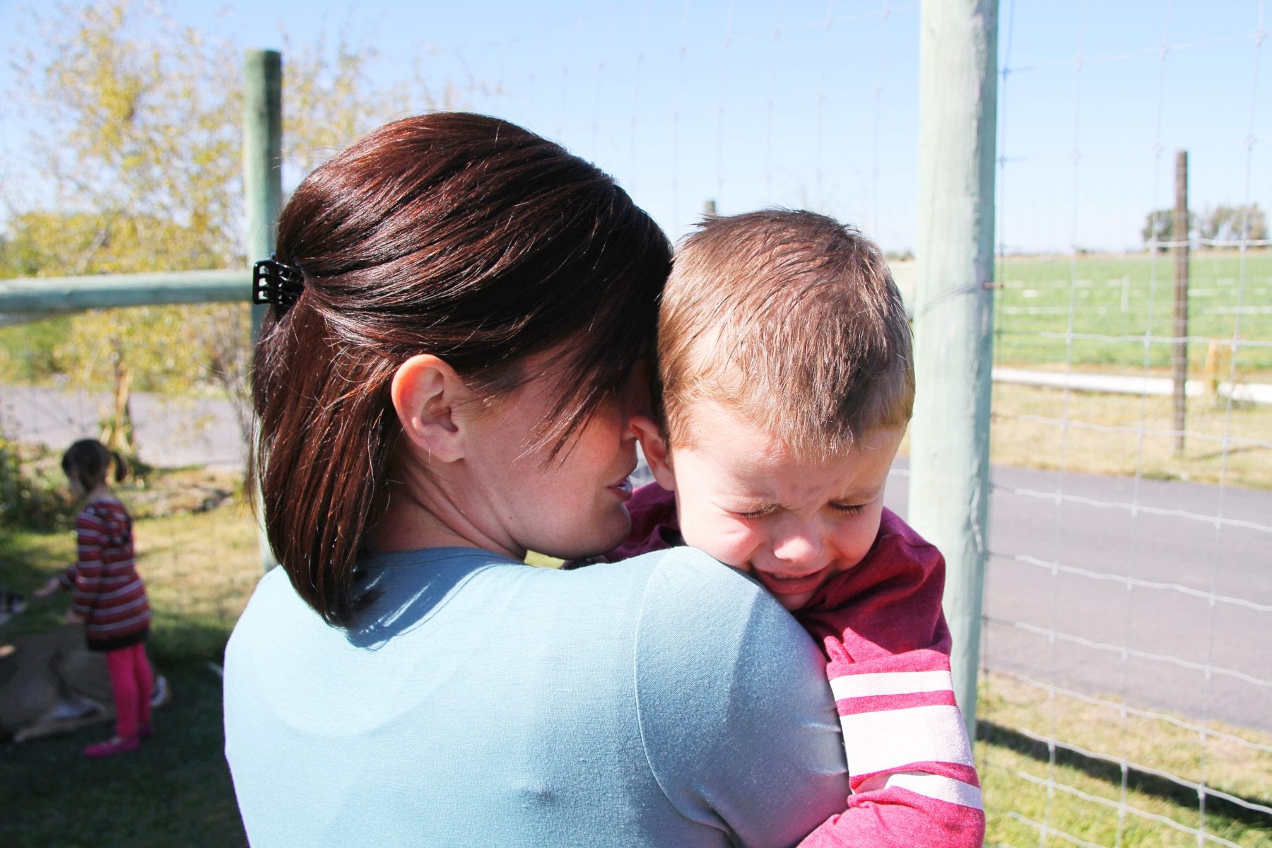 My little guy gave it a try too……but the deer pawed his stomach with his hoof, begging for more grass. And, well, if felt like punch to the gut. And he was traumatized.