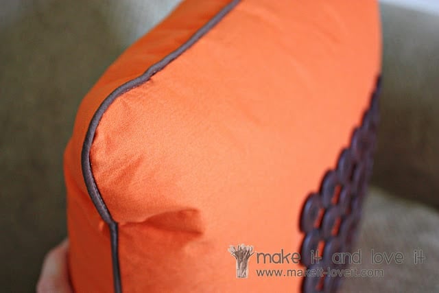Now, how should you start and stop your piping if you’re going all the way around something? There are nicer and fancier ways to do this but here’s the quick/no-fuss way to do it. Let the first end of your piping hang over the edge of your fabric and then start sewing your piping right in place. When you go all the way around, let your other end go over the fabric and sew right over it, stitching it right in place as well.