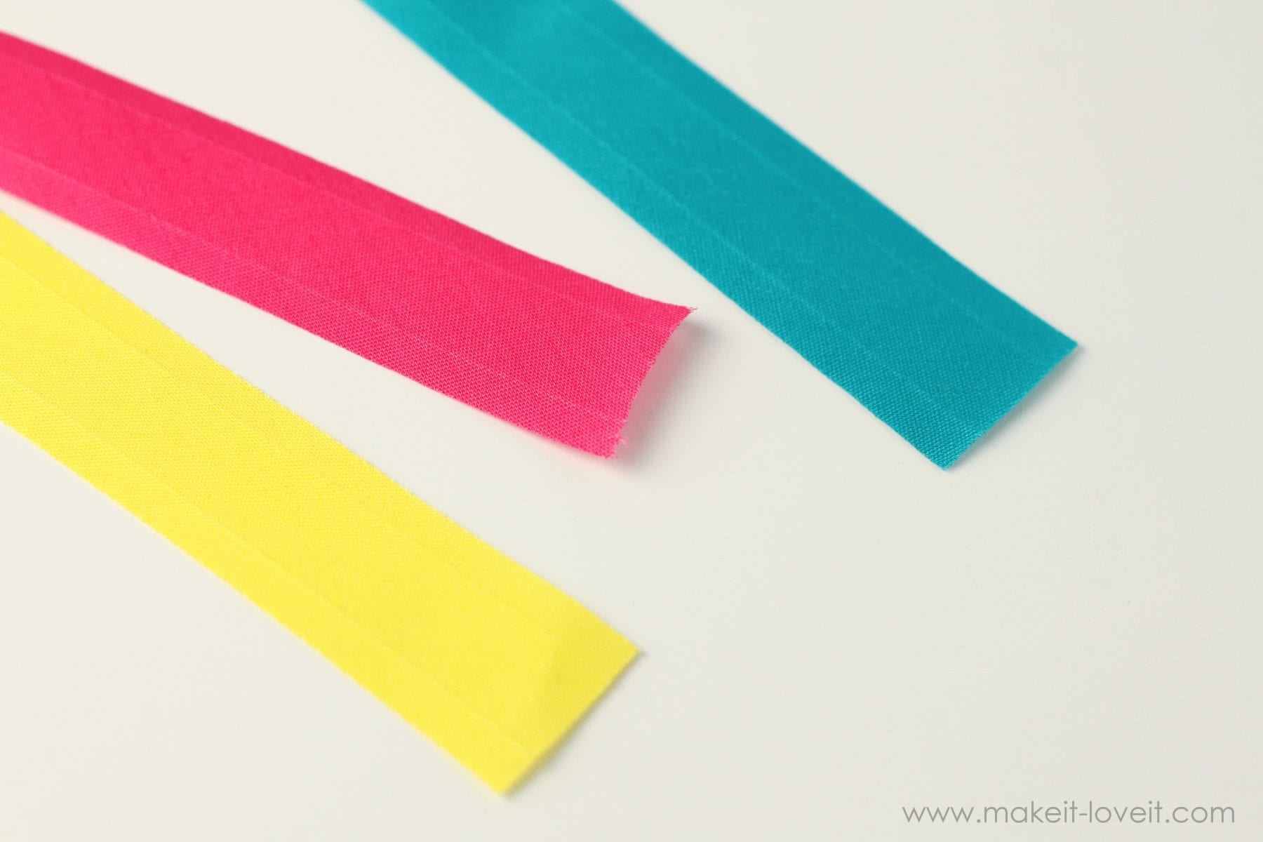 First, let’s make some piping from bias tape.  Take your bias tape out of the packaging and iron it flat.
