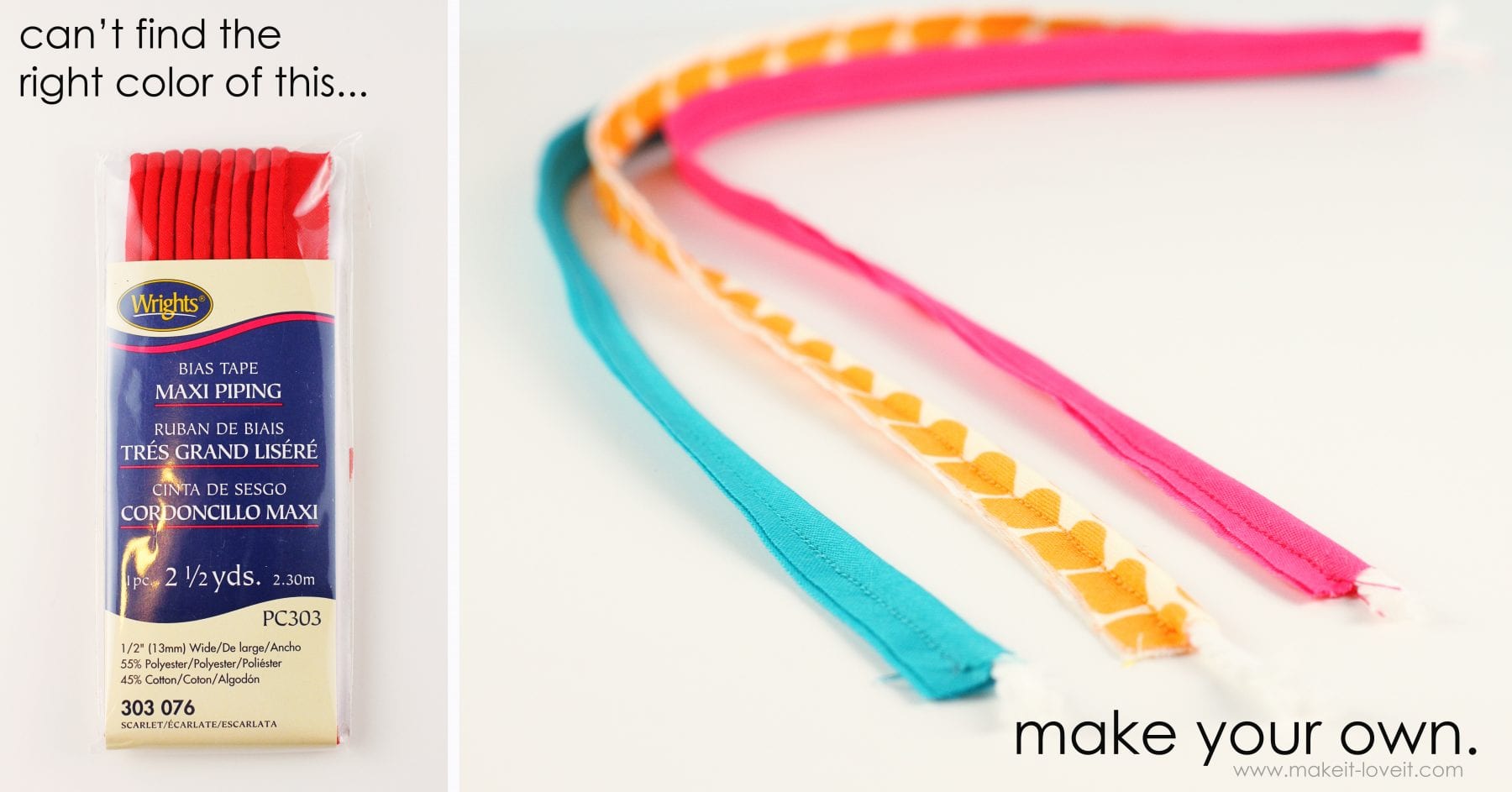Now, if you can’t find the right color of bias tape, cut your own strip of fabric instead of using bias tap.  But your strip of fabric NEEDS to be cut on the bias.  This will help the piping curve better around corners and slight curves.  (More on making bias tape here.)  Are you unsure how wide to make your strip?  This will help: