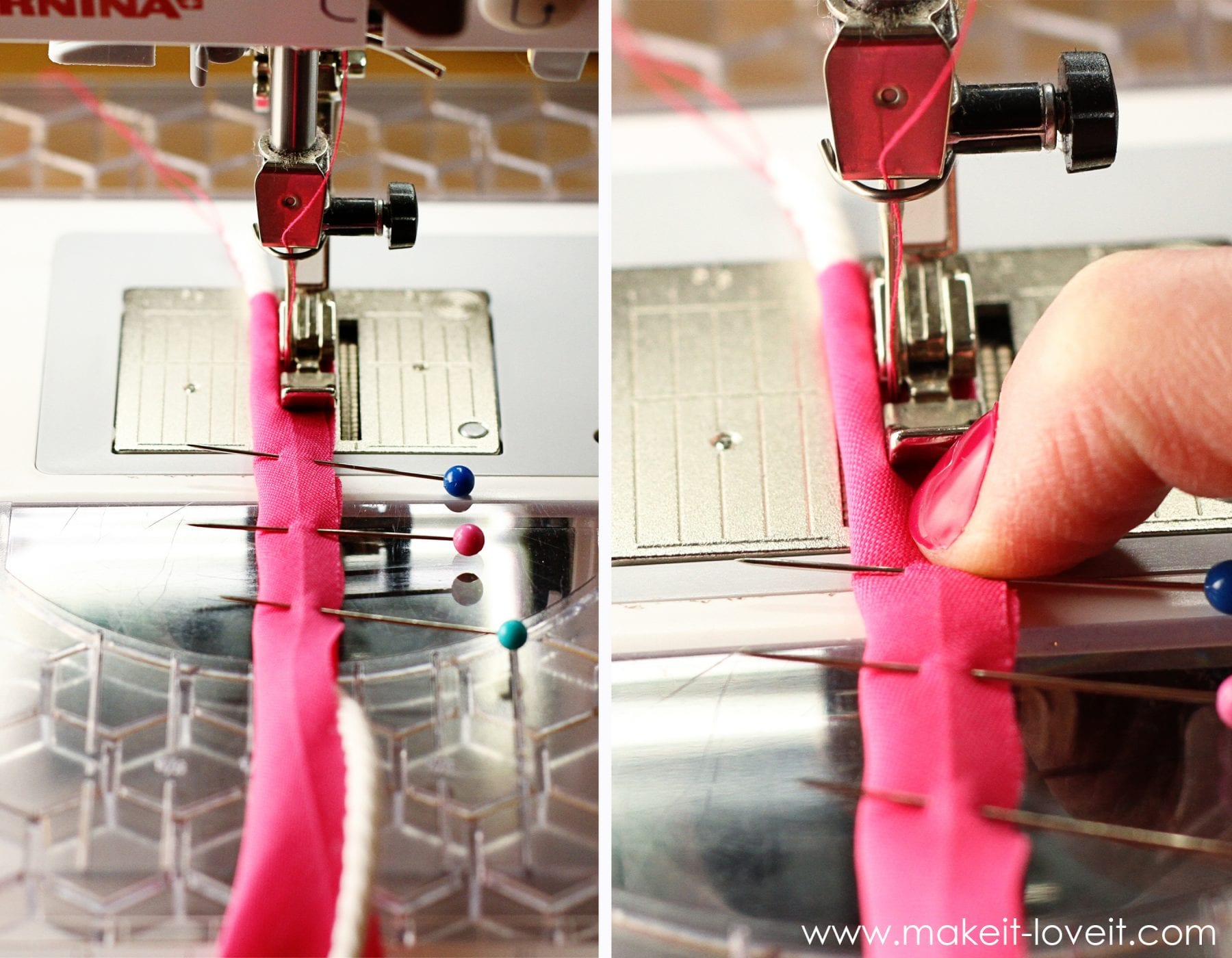 Then, fold your strip of fabric in half, sandwiching the cording right down the middle, then pin it in place.  (I always keep a bit of cording poking out the end, just so that it doesn’t slip inside.)