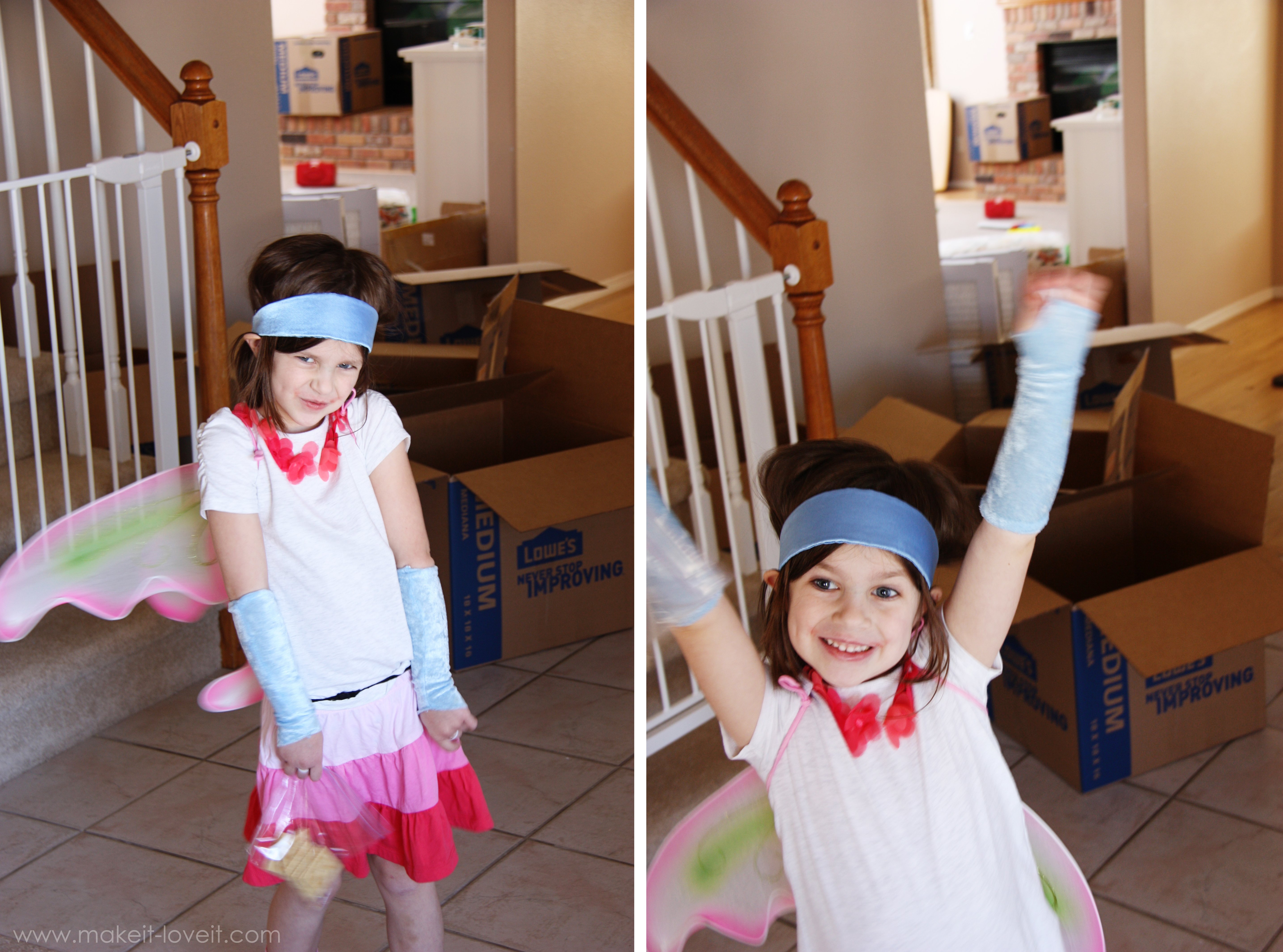One good thing about moving…..is that you find lost things.  Like our box of dress-ups.  This little lady has been flitting around in random pieces of dress-up clothing, happy as a clam.